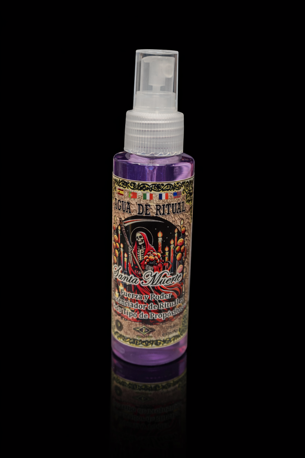 Ingredientes energéticos: Agua bendecida, esencias rituales, extractos aromáticos sagrados, vibración consagrada a la Santa Muerte