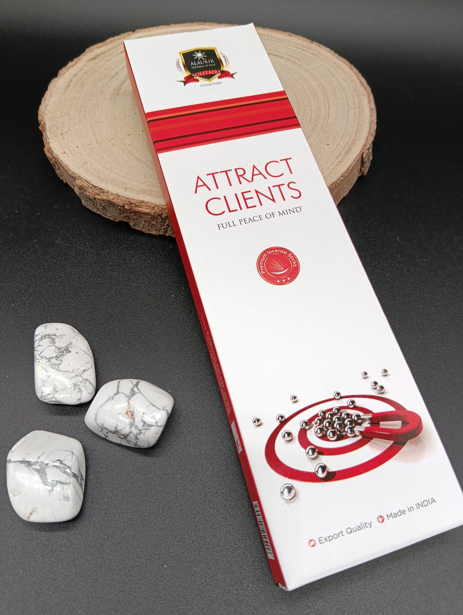 Alaukik Atrae Clientes es un incienso diseñado para potenciar la energía de prosperidad y favorecer el flujo constante de nuevas oportunidades comerciales. Su mezcla aromática se utiliza tradicionalmente para activar la energía de atracción, mejorar la vibración del negocio y generar un ambiente propicio para el aumento de ventas.