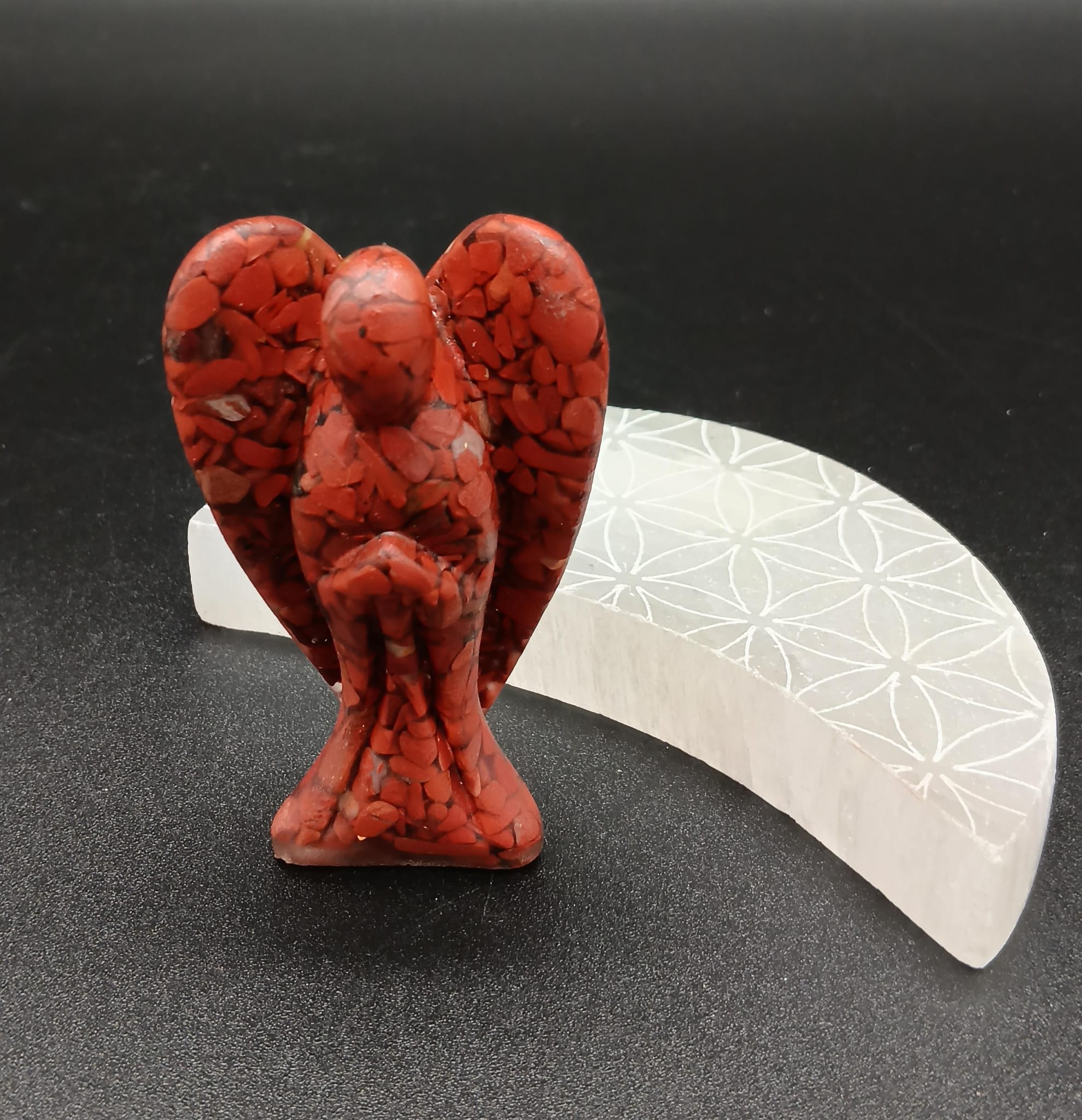Estos ángeles de orgonita, elaborados con chips de jaspe rojo, son figuras cargadas de fuerza vital, enraizamiento y protección energética. Con una altura aproximada de 7 cm, cada pieza actúa como un canal energético que combina la capacidad transmutadora de la orgonita con la energía firme y estabilizadora del jaspe rojo, creando un campo de seguridad, resistencia y vitalidad en el espacio donde se coloquen.