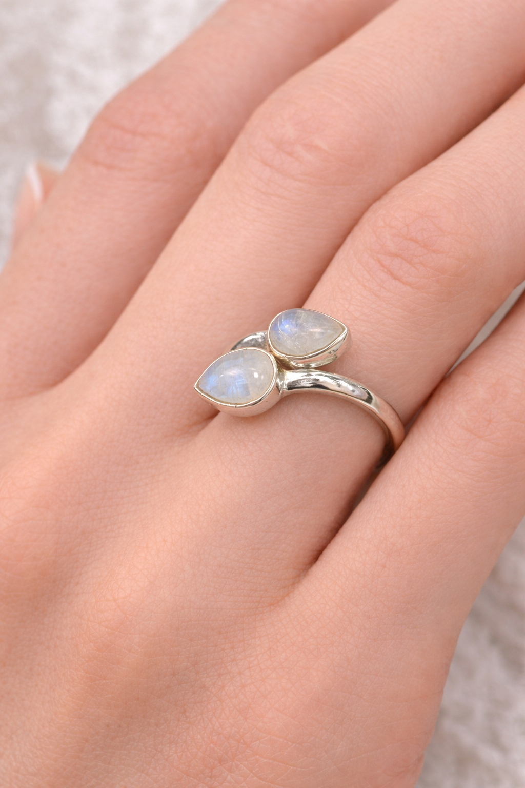 Este anillo ajustable está elaborado en plata de ley 925 y adornado con dos piedras naturales de piedra luna en forma de lágrima, enfrentadas en un diseño abierto que irradia suavidad y misterio. La piedra luna es conocida por su conexión con los ciclos femeninos, la intuición y el equilibrio emocional.