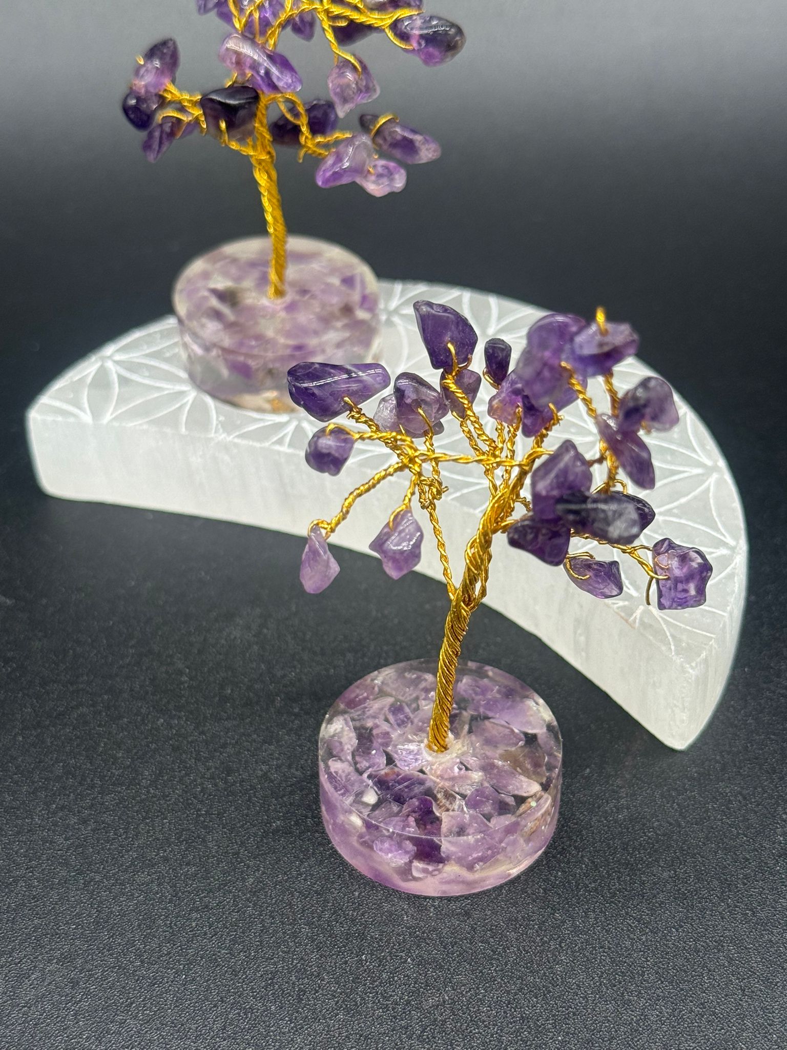 Este arbolito está elaborado con piedras de amatista, un cristal profundamente asociado a la paz interior, la sabiduría y la conexión espiritual. Su forma, inspirada en el árbol de la vida, simboliza crecimiento, equilibrio y expansión consciente.