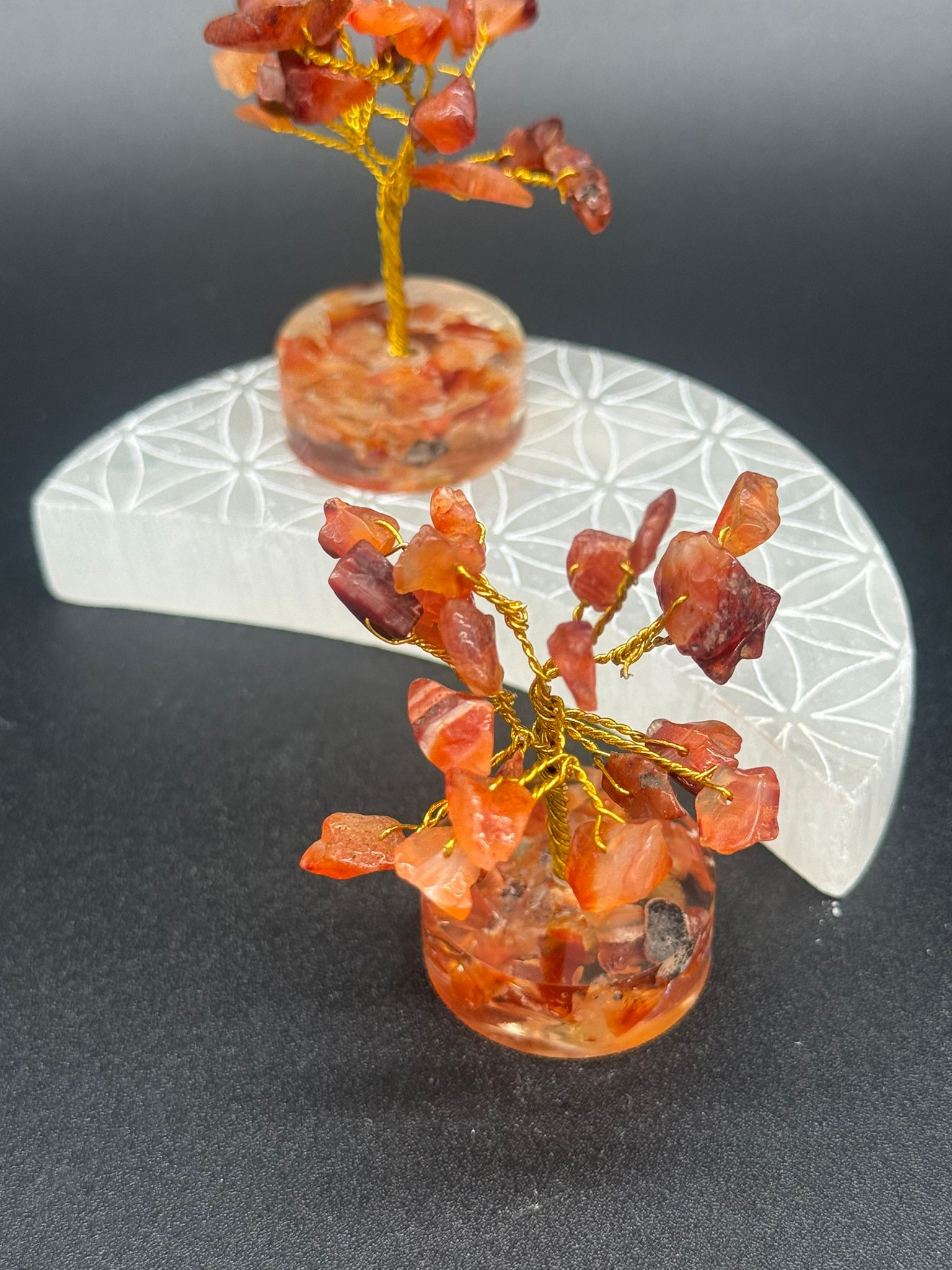 Este arbolito artesanal está elaborado con alambre y piedras naturales de cornalina, un mineral energizante asociado con la vitalidad, la motivación y la creatividad.