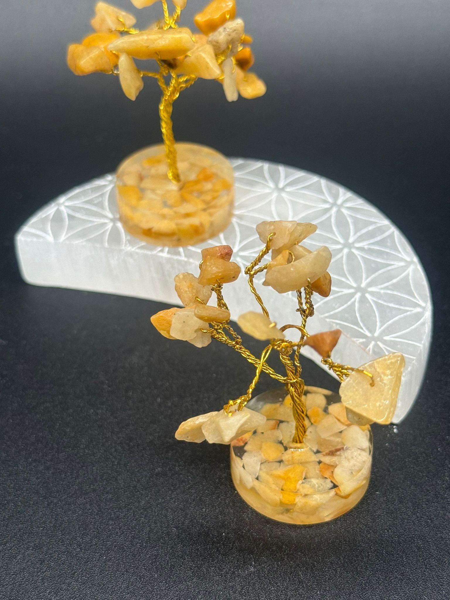 Este arbolito artesanal está hecho con piedras naturales de cuarzo dorado, también conocido como cuarzo con limonita, un mineral que combina la energía del cuarzo con las propiedades revitalizantes de la limonita.