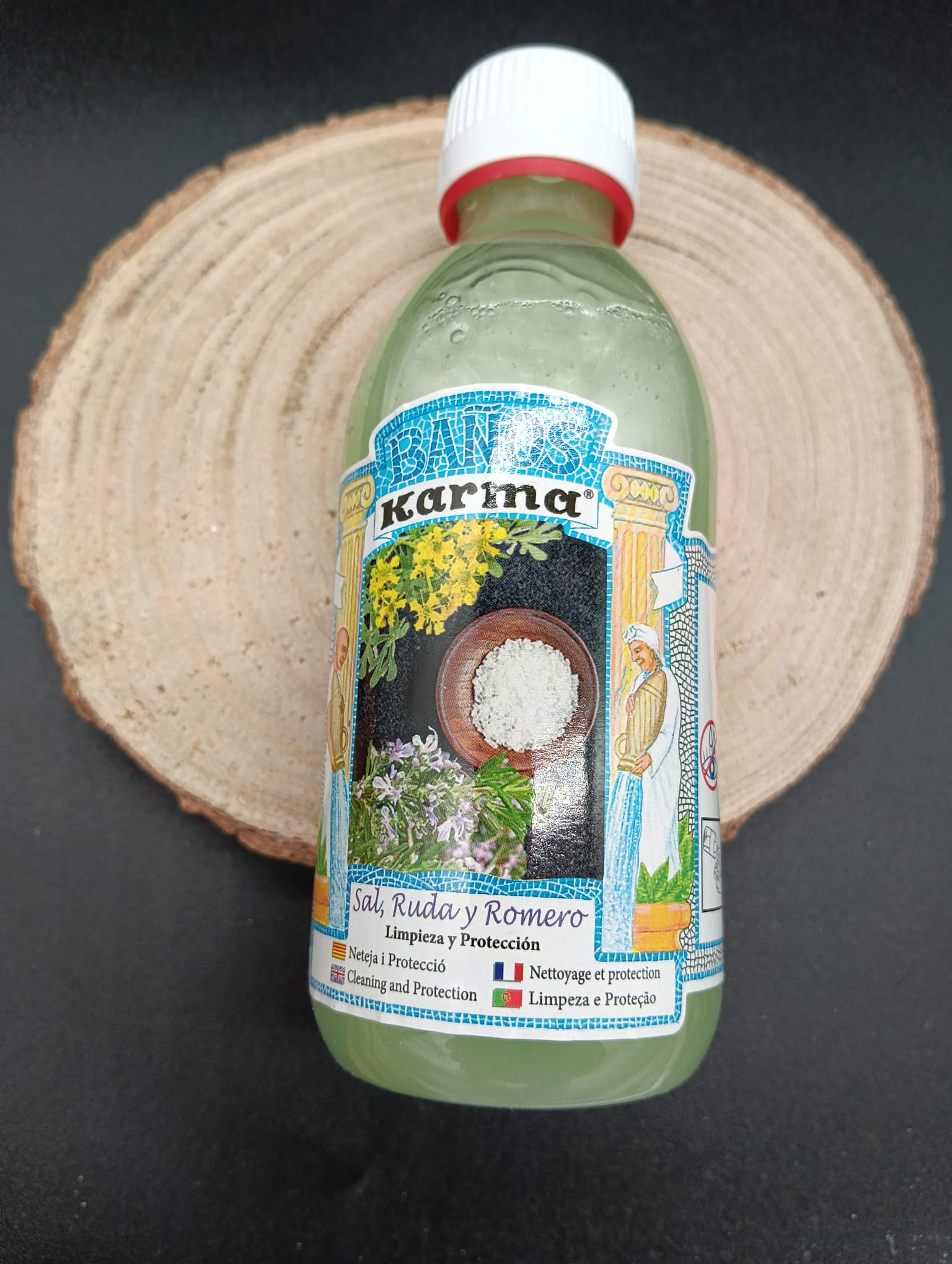 El Baño Sal, Ruda y Romero de la marca Karma es un gel de baño esotérico diseñado para realizar limpiezas energéticas profundas y proporcionar protección espiritual, combinando el poder purificador de la sal, la energía protectora de la ruda y la vibración revitalizante del romero.