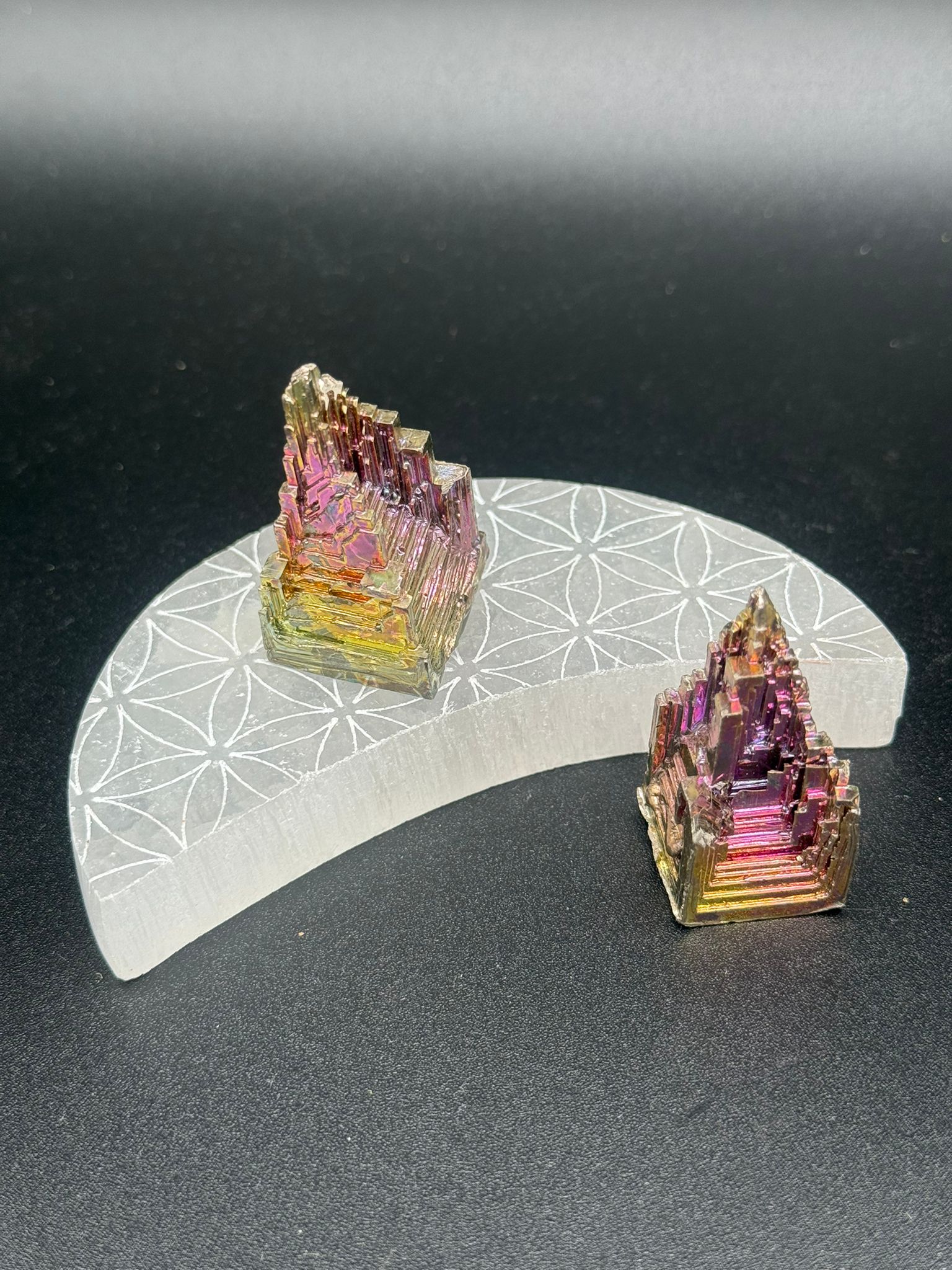 El bismuto es un metal cristalino con un brillo iridiscente único, cuyas formas geométricas naturales y colores tornasolados lo convierten en una joya visual y energética. Es conocido en el mundo esotérico como un potente canalizador de transformación, orden y evolución personal.