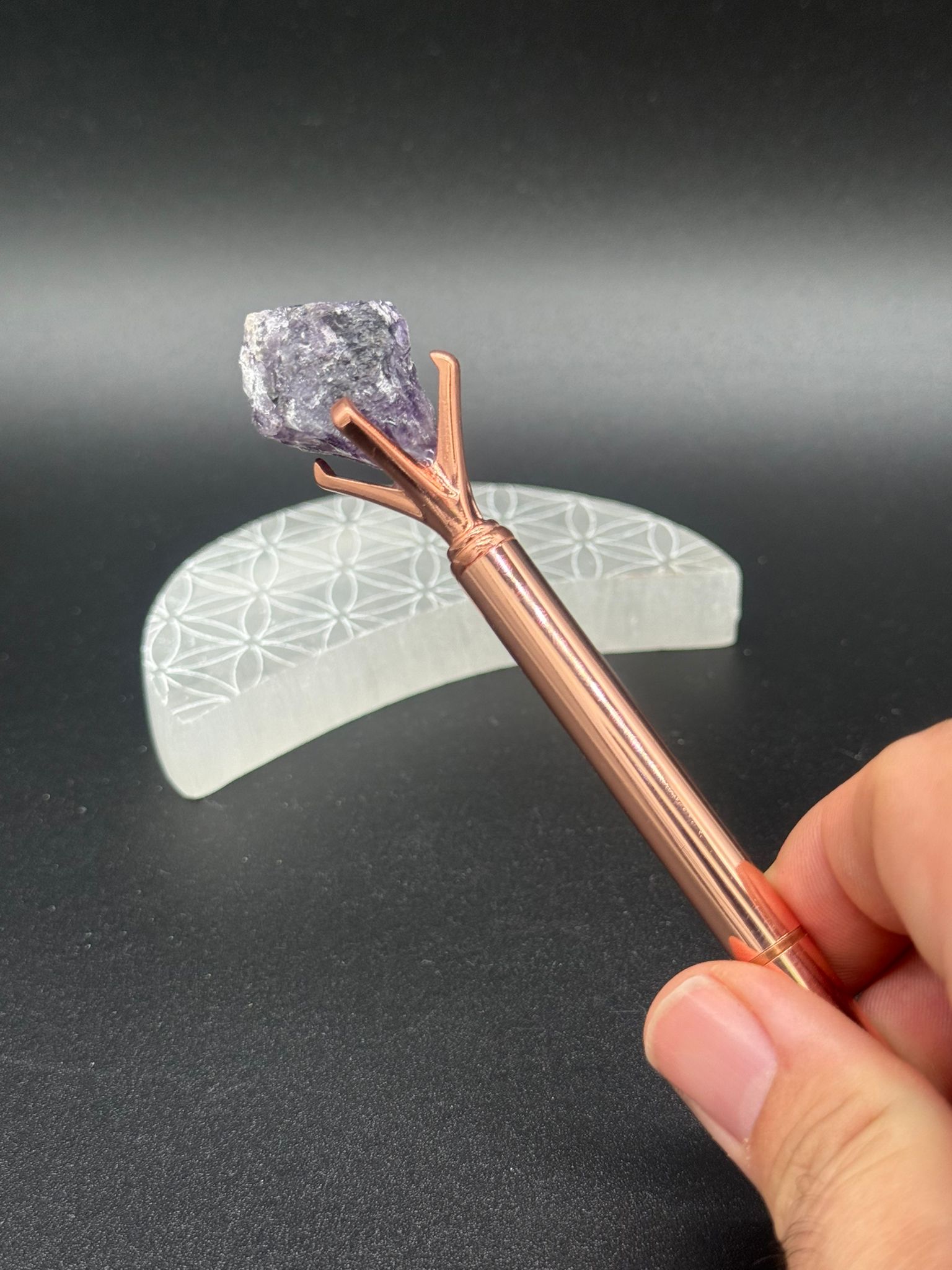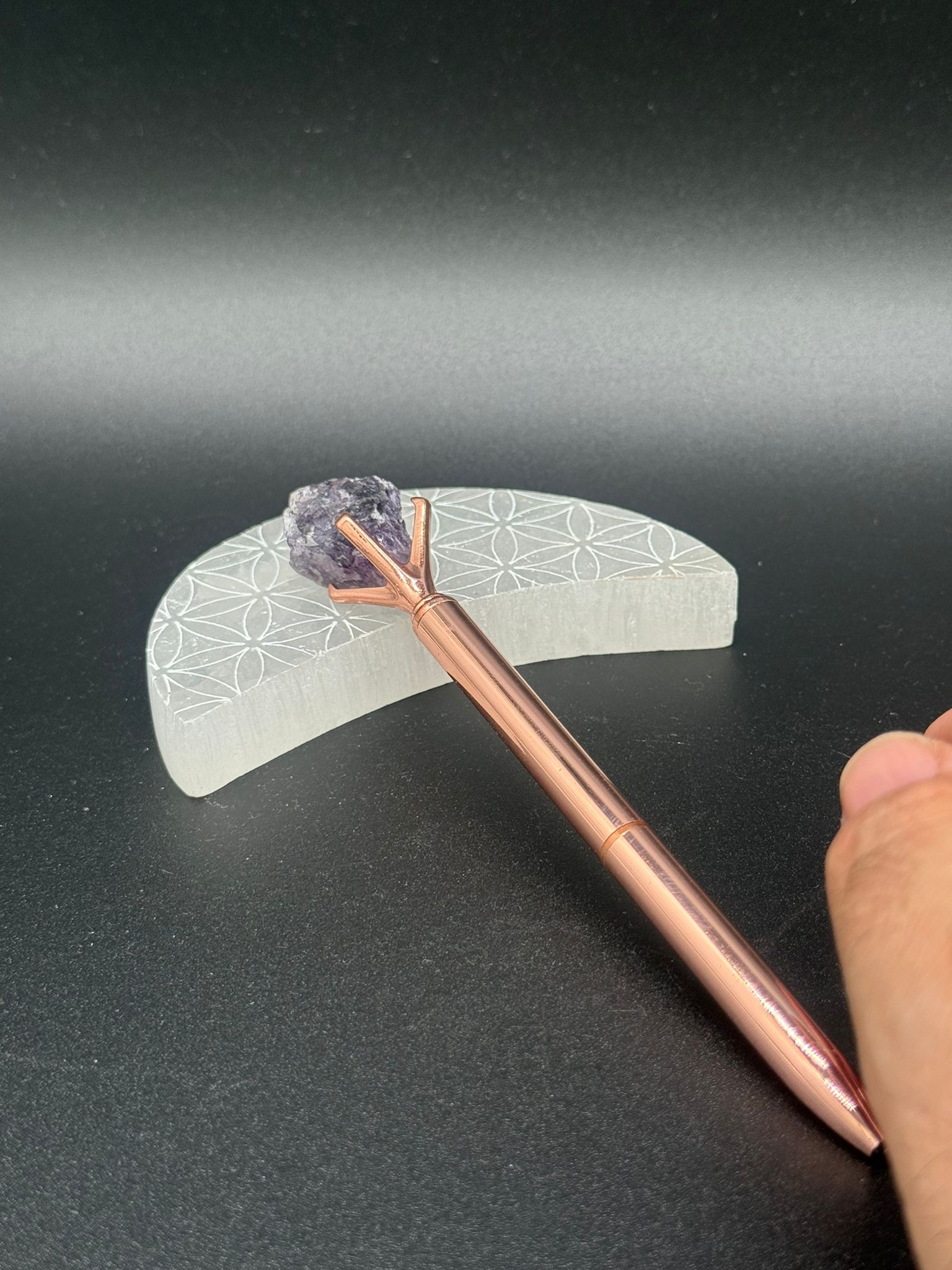 Este bolígrafo de elegante tono bronce fusiona estilo y energía espiritual. En su parte superior, lleva una piedra de amatista en bruto, reconocida por sus propiedades de protección energética, claridad mental y apertura espiritual.