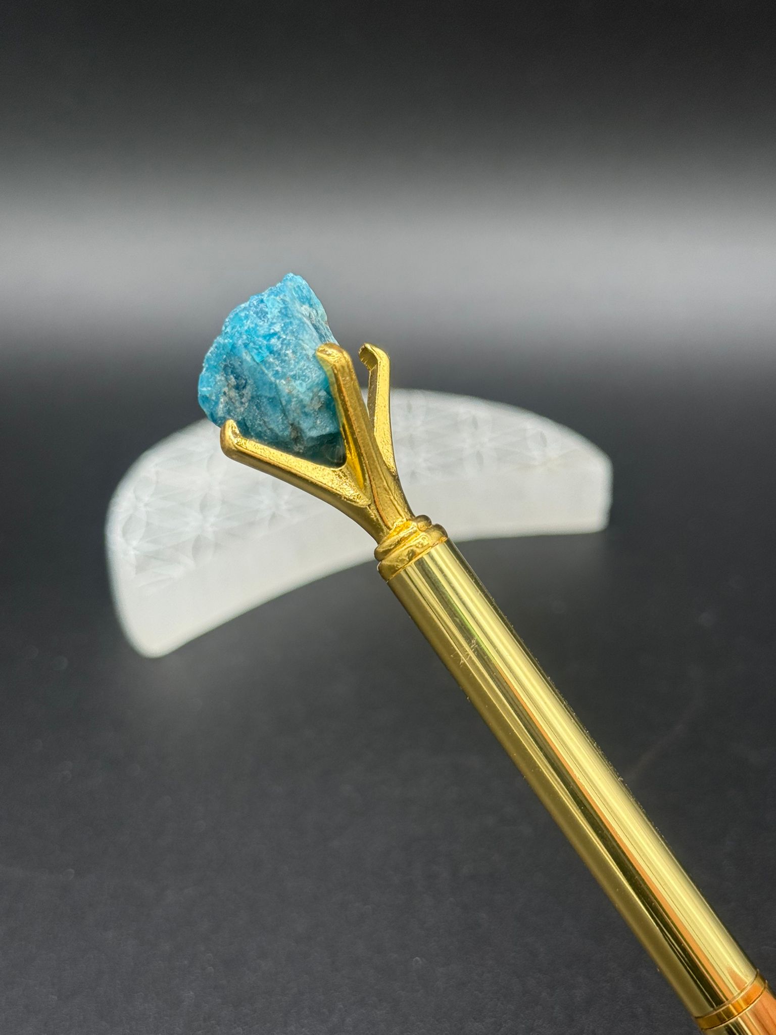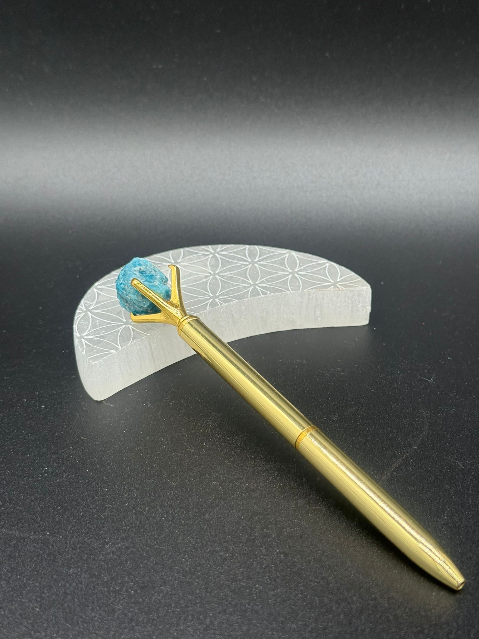 Este bolígrafo de acabado dorado destaca por su elegancia y su energía vibrante. En su parte superior, lleva una piedra de apatito en bruto, asociada con la claridad mental, la creatividad y la apertura del chakra garganta, facilitando la expresión auténtica y la comunicación consciente.