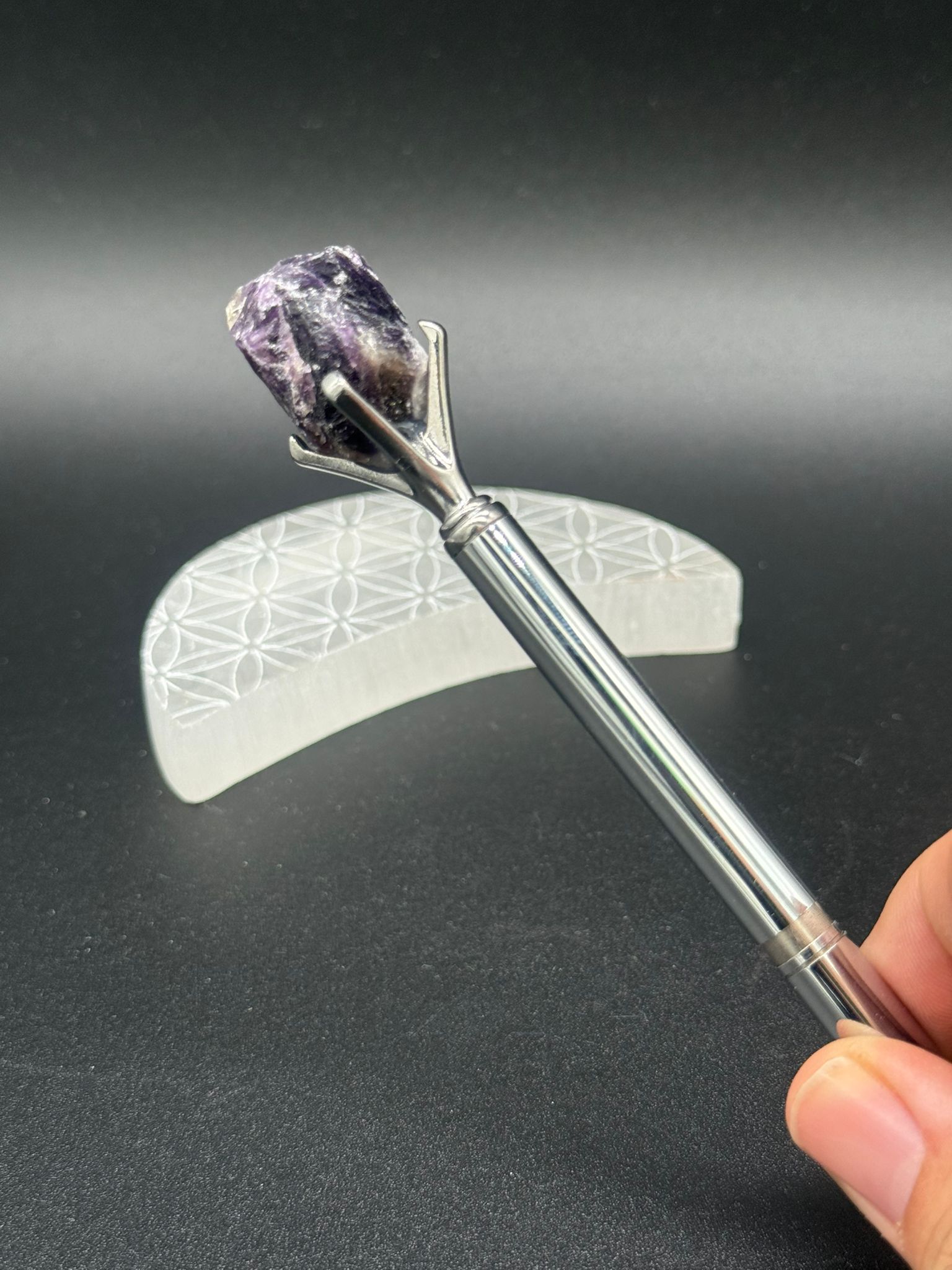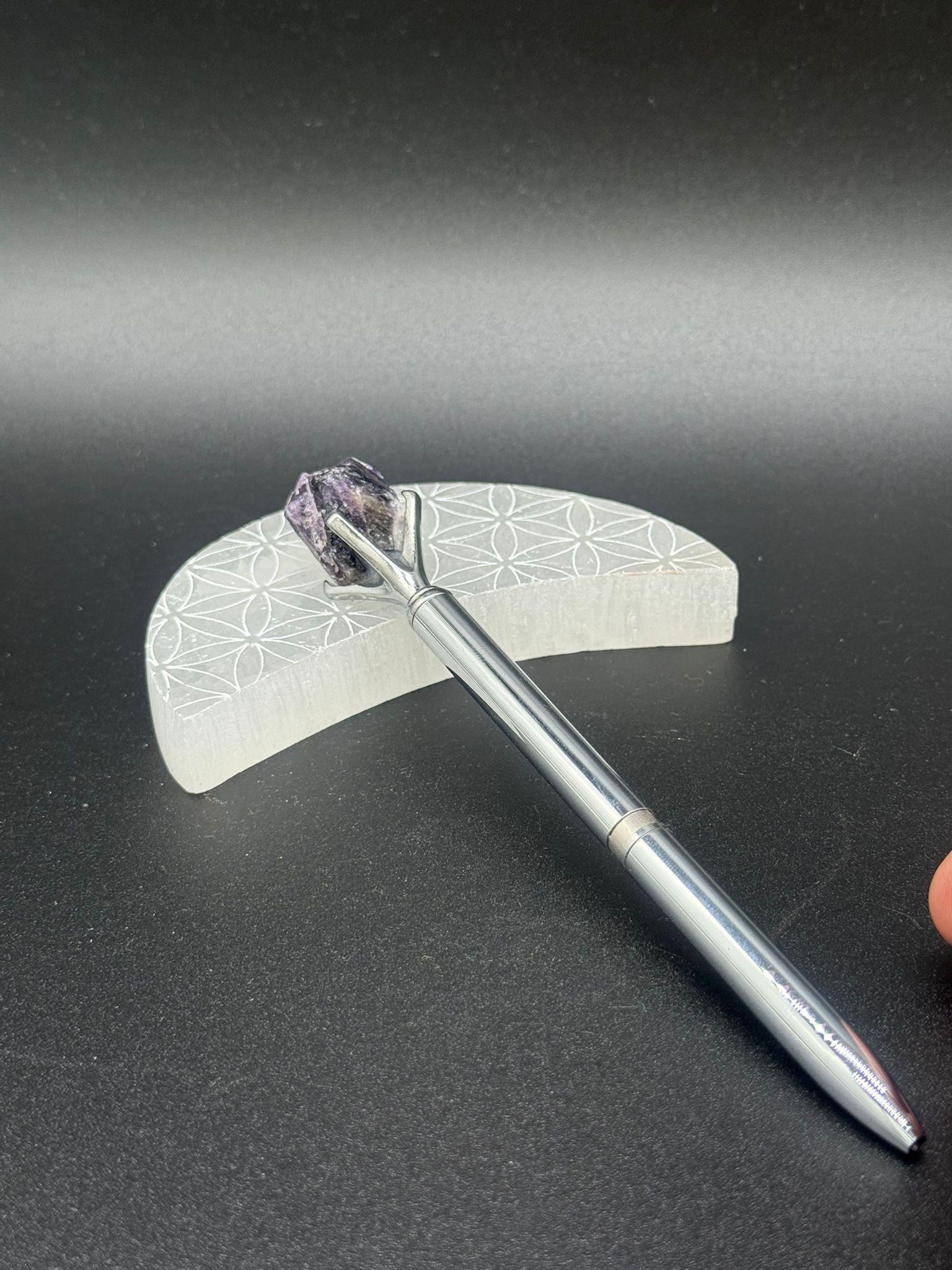 Este sofisticado bolígrafo de color plateado une elegancia con energía sutil. En su parte superior, lleva una piedra de amatista en bruto, conocida por sus propiedades de protección, calma mental y elevación espiritual.