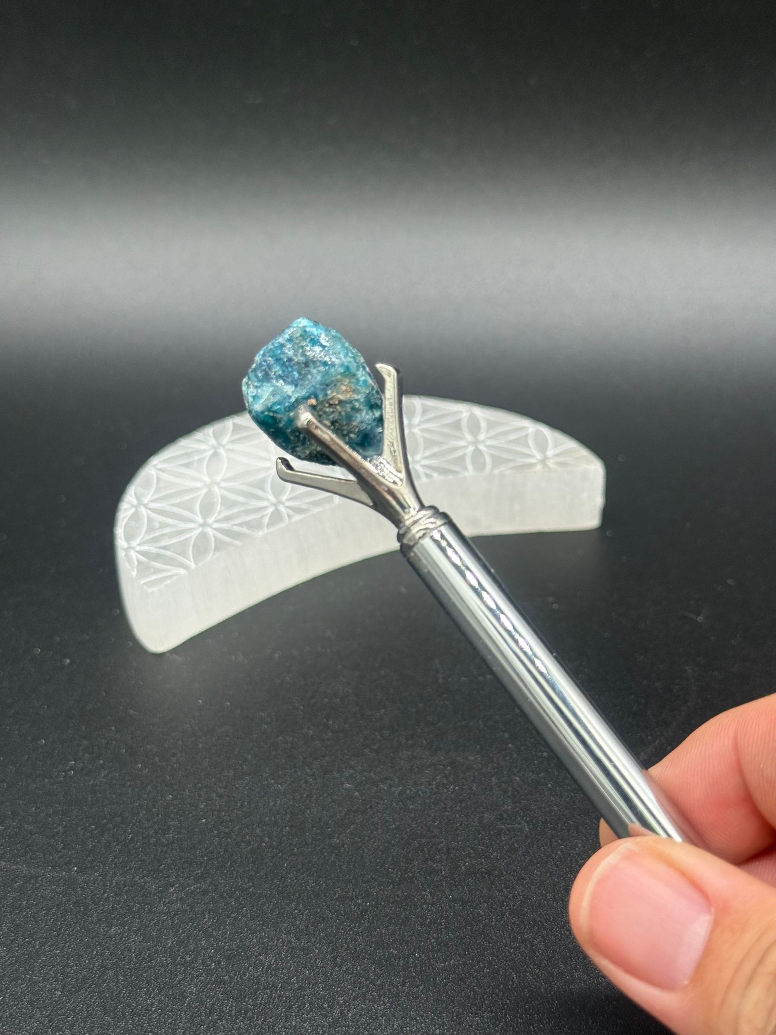 Este bolígrafo de tono plateado combina diseño elegante con una fuerte carga energética. En su parte superior, incorpora una piedra de apatito en bruto, reconocida por estimular la creatividad, fortalecer la comunicación y favorecer la expresión de ideas desde un lugar de verdad y conciencia.