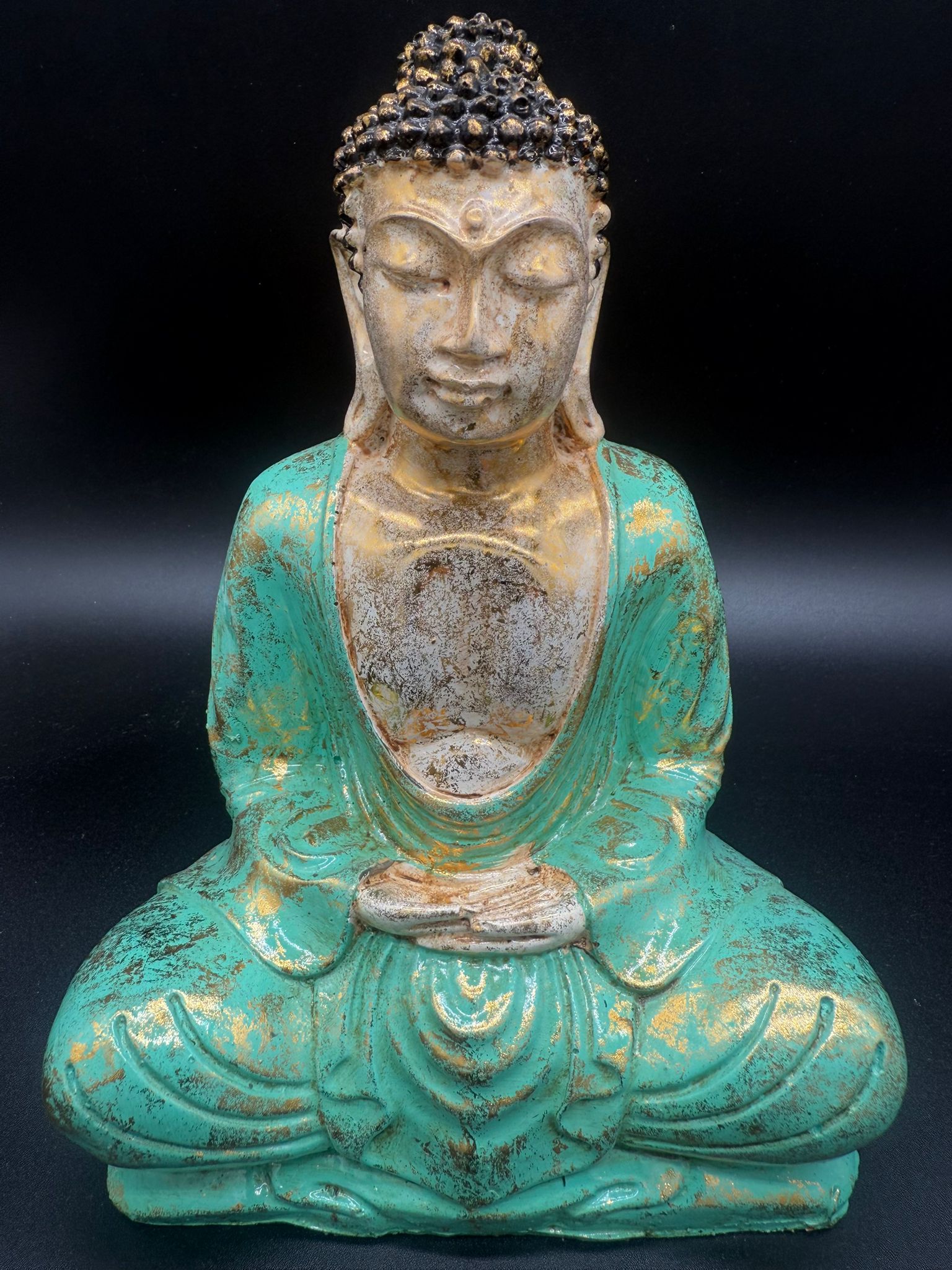 Esta imponente figura de Buda sentado, en un vibrante tono turquesa, simboliza la tranquilidad, la sanación y la comunicación espiritual. El color turquesa, asociado al equilibrio emocional y al chakra de la garganta, fomenta la claridad de pensamiento, la expresión consciente y la armonía interior. Con 25 cm de altura, se convierte en un elemento central para un altar, espacio de meditación o rincón de introspección.