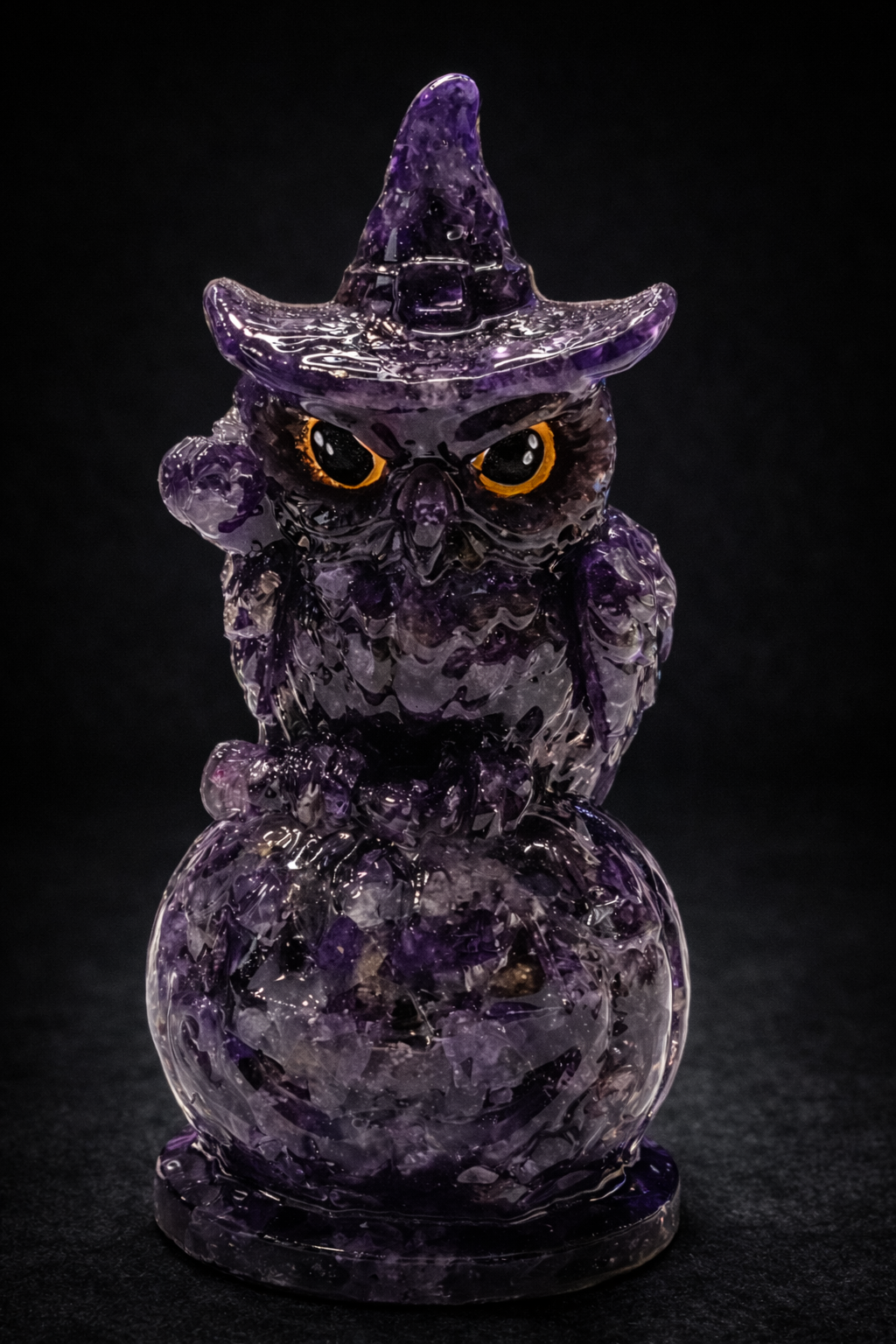 Búho esotérico elaborado en orgonita con amatista, posado sobre una calabaza energética, una pieza cargada de simbolismo mágico y protección espiritual.