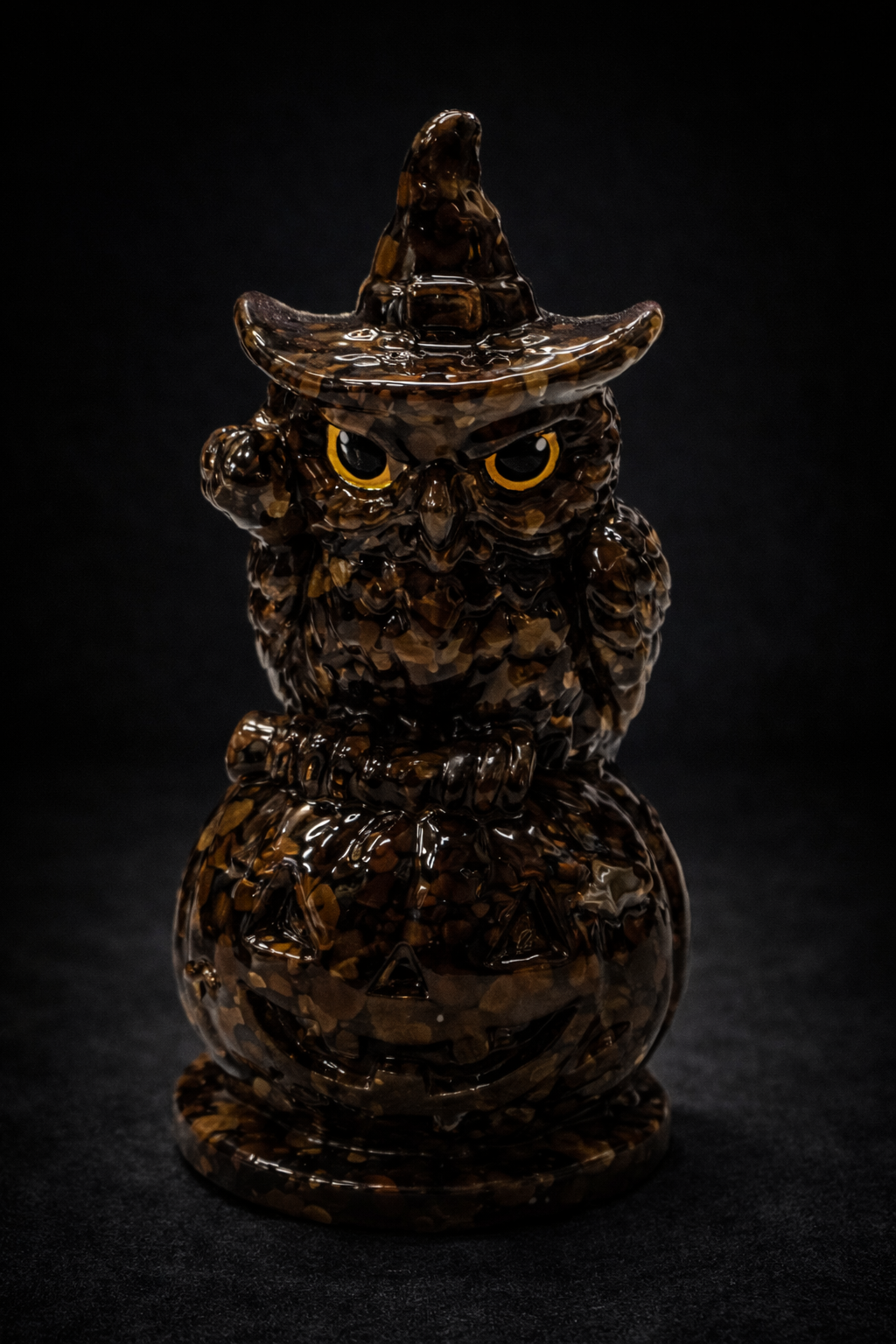 Búho de orgonita elaborado artesanalmente con ojo de tigre, representado con sombrero de bruja y posado sobre una calabaza tallada.