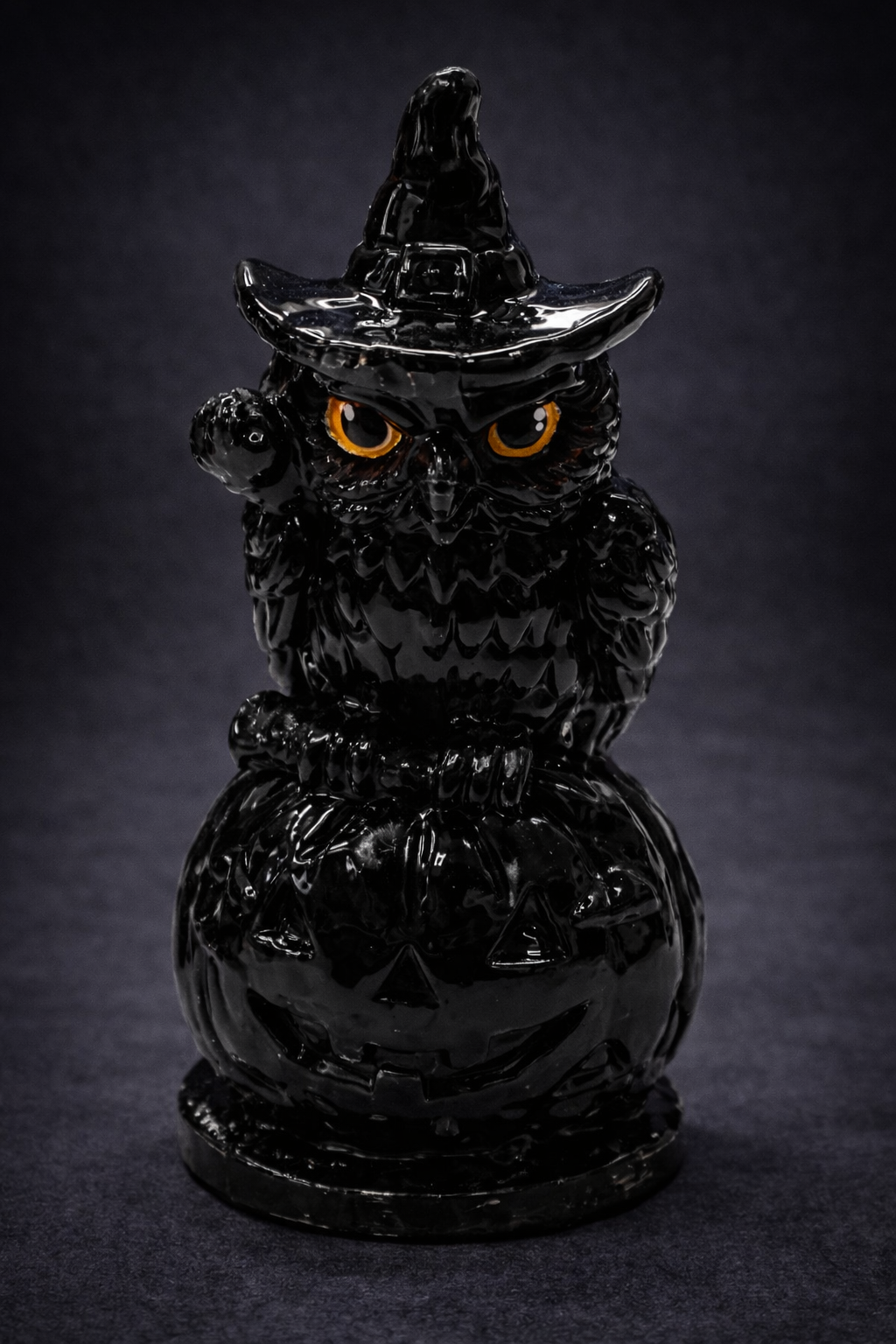 Búho de orgonita elaborado artesanalmente con turmalina negra, representado con sombrero de bruja y posado sobre una calabaza tallada.