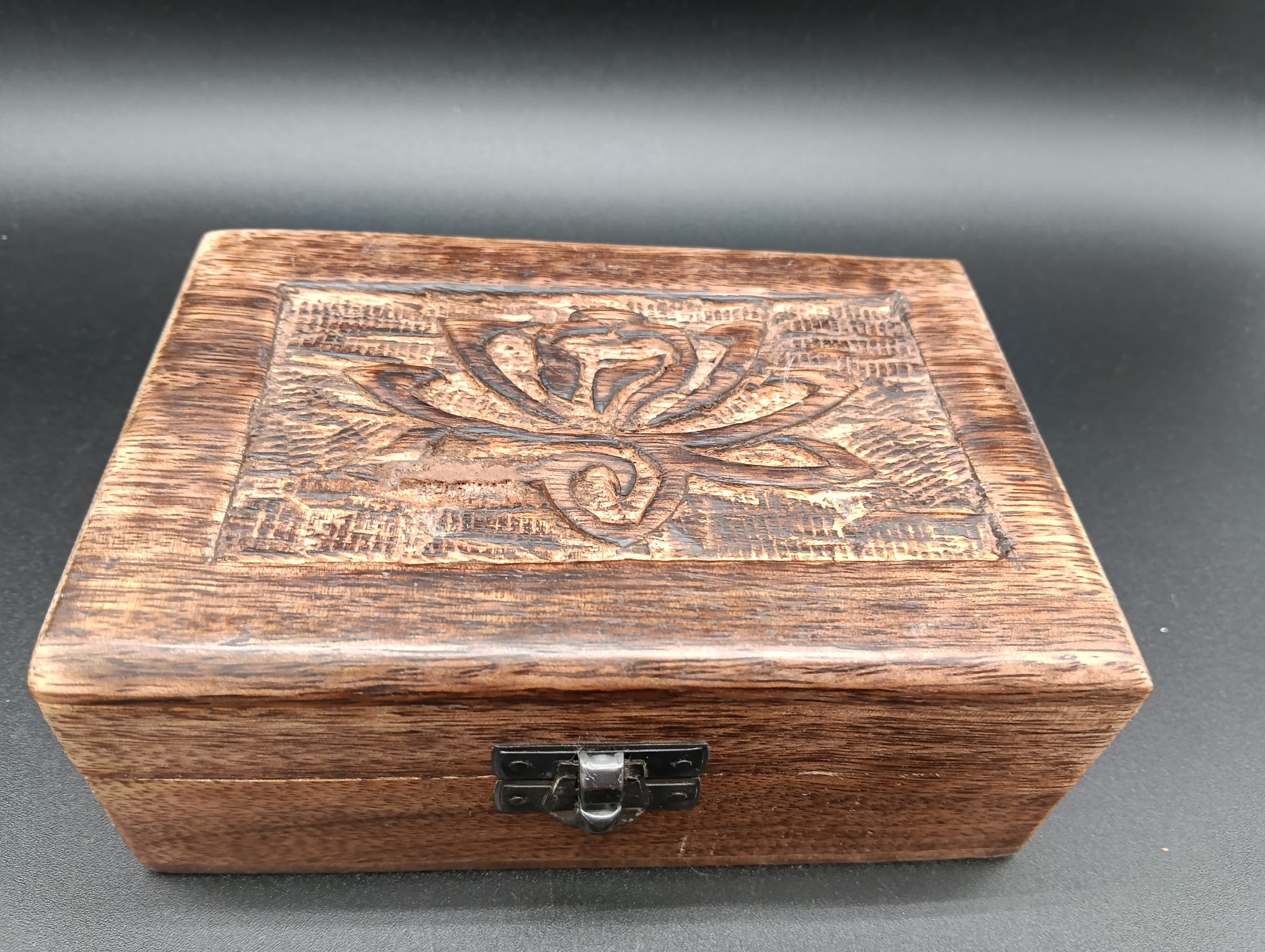 Esta elegante caja de madera presenta en su tapa el símbolo del loto finamente tallado, una figura sagrada que representa la pureza del alma, el renacimiento espiritual y la elevación de la conciencia. El loto emerge de las aguas profundas para florecer en luz, recordándonos la capacidad de transformación, sanación y crecimiento interior.