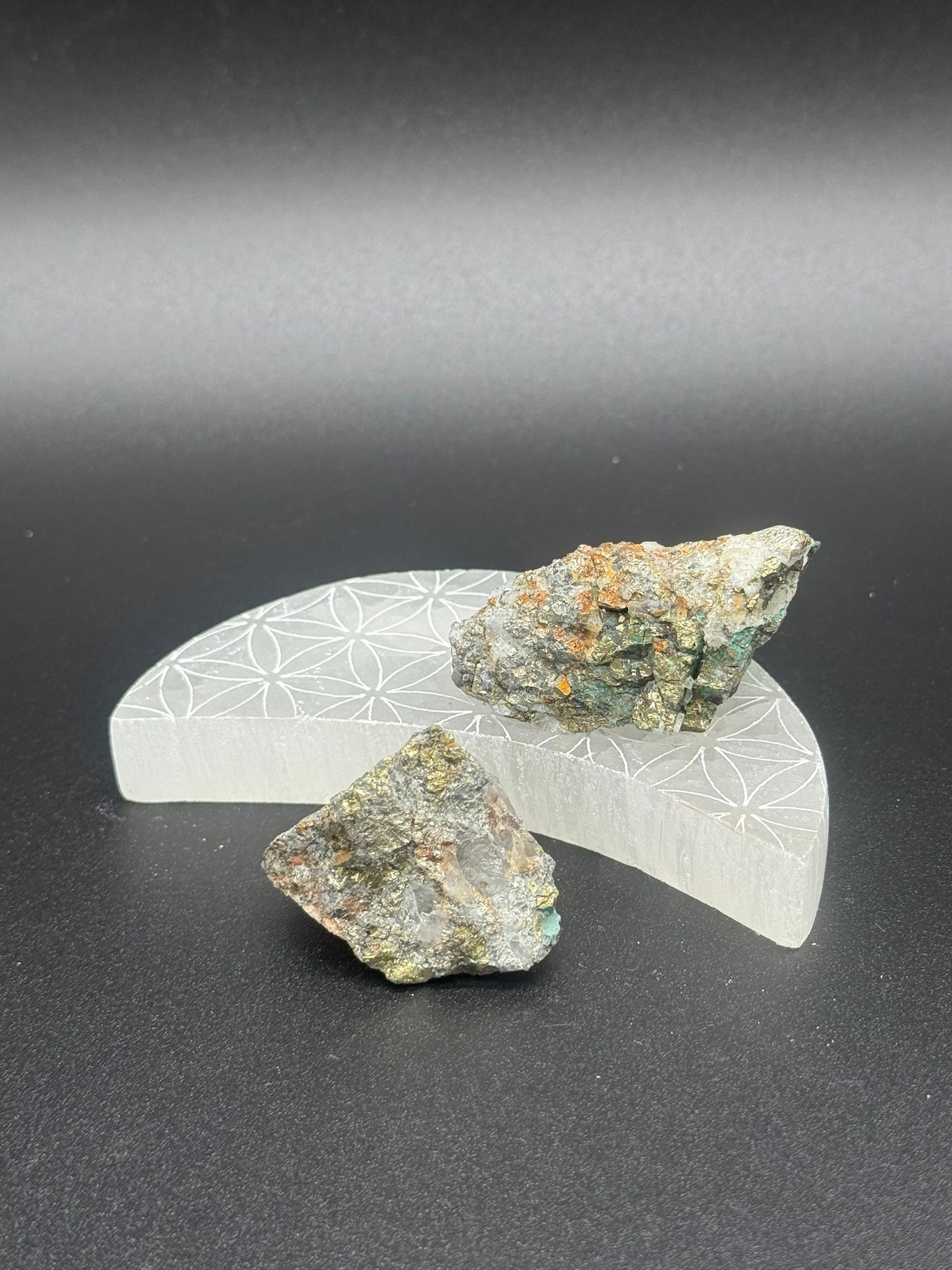 La calcopirita es una piedra que irradia una vibración poderosa y dinámica, conocida por estimular la energía vital, la claridad mental y la conexión intuitiva. Espiritualmente, actúa como un amplificador de la conciencia, ayudando a elevar la frecuencia energética y facilitando el acceso a estados superiores de percepción.