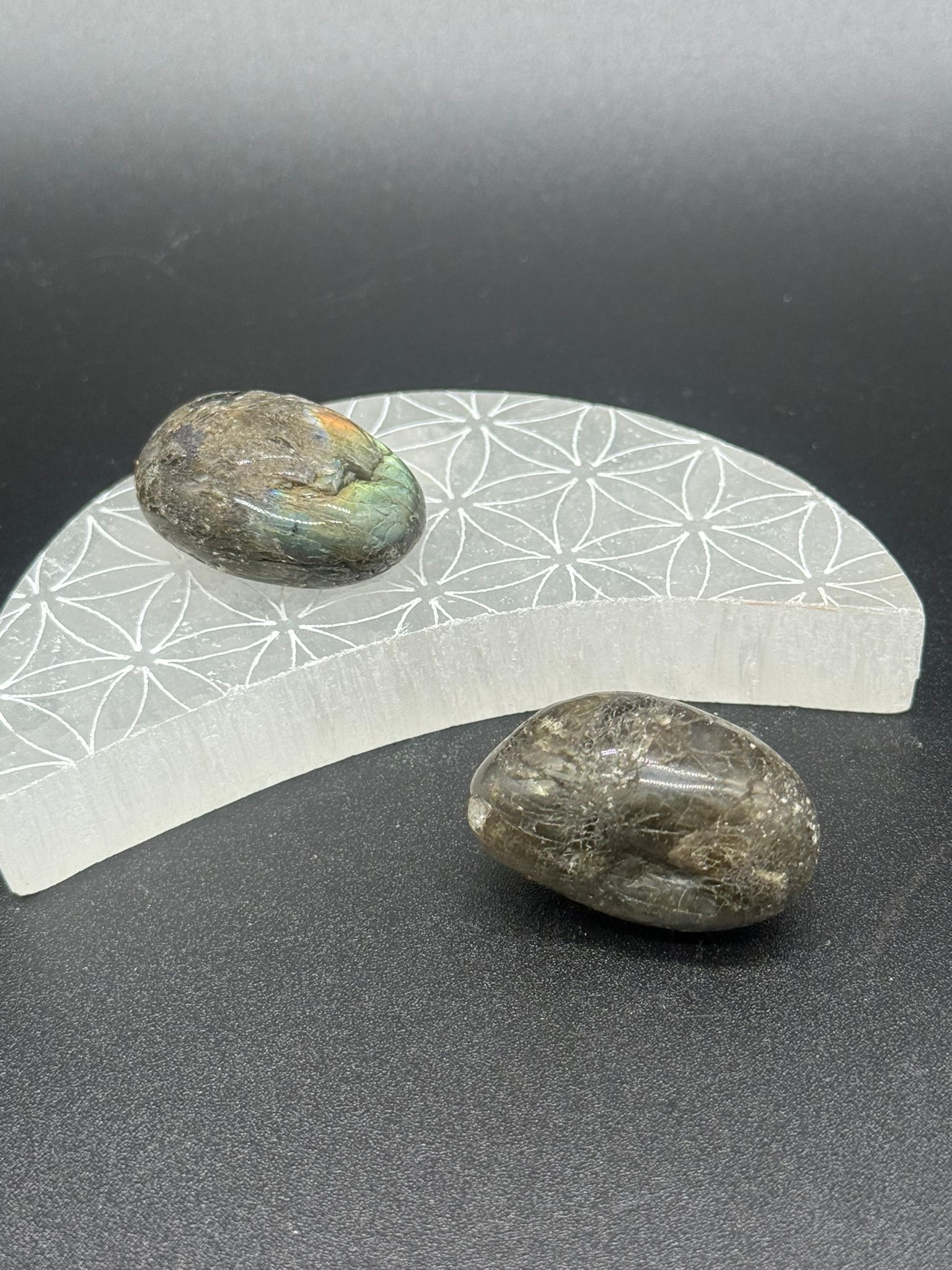 Los cantos rodados de Labradorita son conocidos por su brillo iridiscente y su poderosa energía mística. Esta piedra es altamente valorada por su capacidad para proteger el aura, elevar la conciencia y potenciar la intuición. Es una aliada esencial para quienes practican meditación, canalización o trabajo energético.