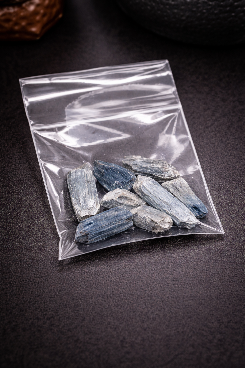 Cada bolsita contiene 11 gramos de cianita azul en bruto, con piezas naturales de aspecto laminar y tonalidades azuladas con reflejos plateados, lo que la convierte en una pieza única tanto a nivel energético como estético.