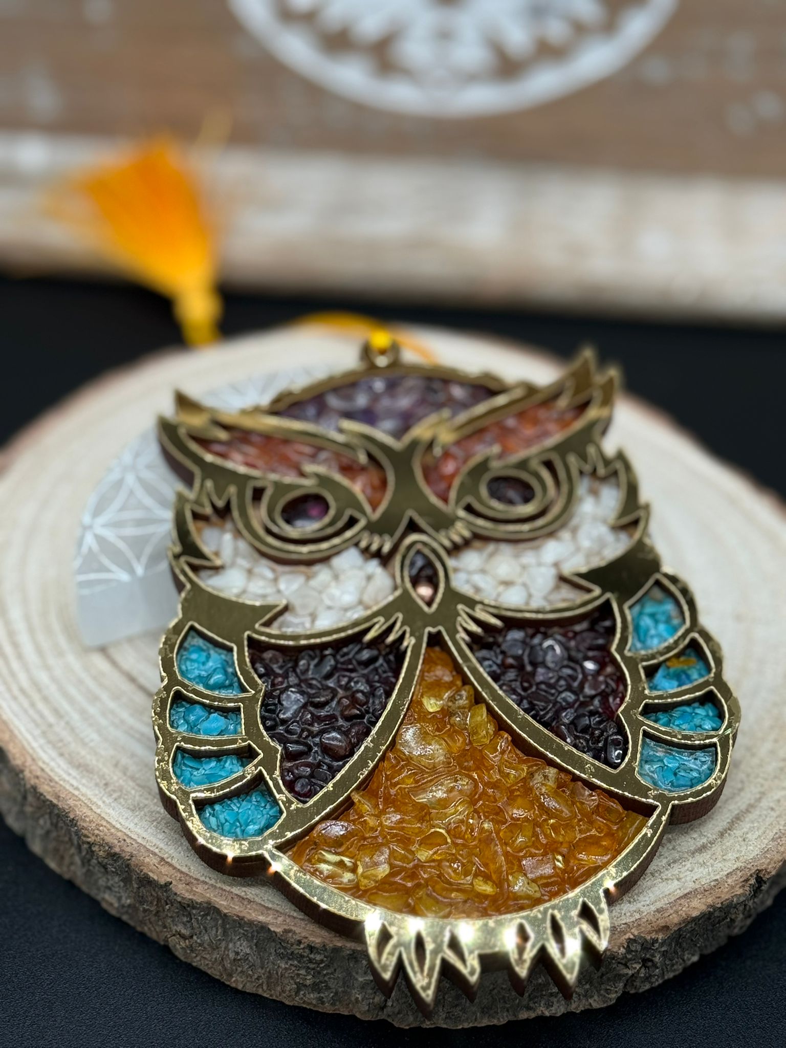 Una pieza que fusiona la sabiduría simbólica del búho con la fuerza silenciosa de los minerales, para llenar tu espacio de energía protectora y conciencia elevada.