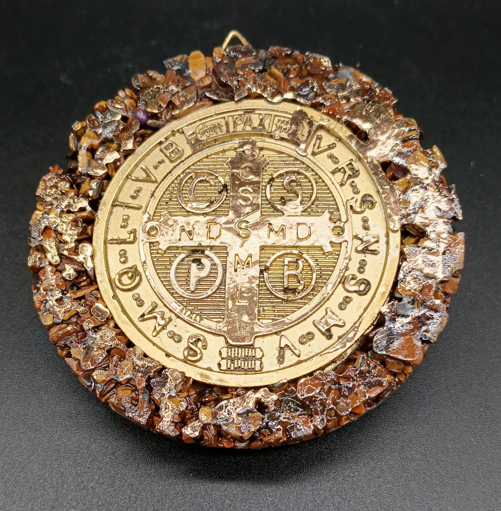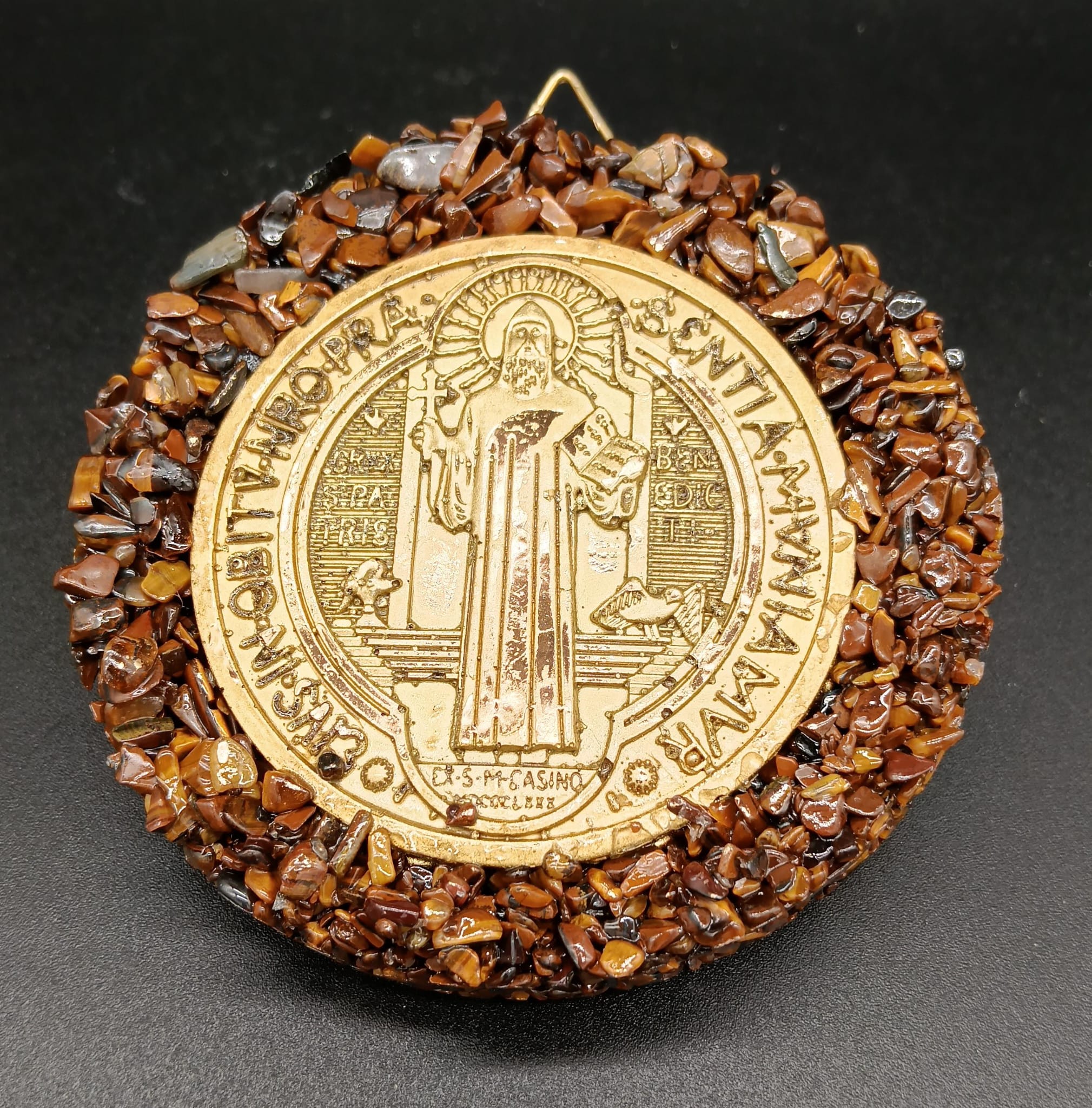 Este colgador de la Medalla de San Benito con Ojo de Tigre es un poderoso amuleto de protección espiritual y fortaleza energética. La Medalla de San Benito es reconocida tradicionalmente por su capacidad para proteger contra energías negativas, influencias no deseadas y desequilibrios espirituales, actuando como un símbolo de fe, resguardo y limpieza energética.