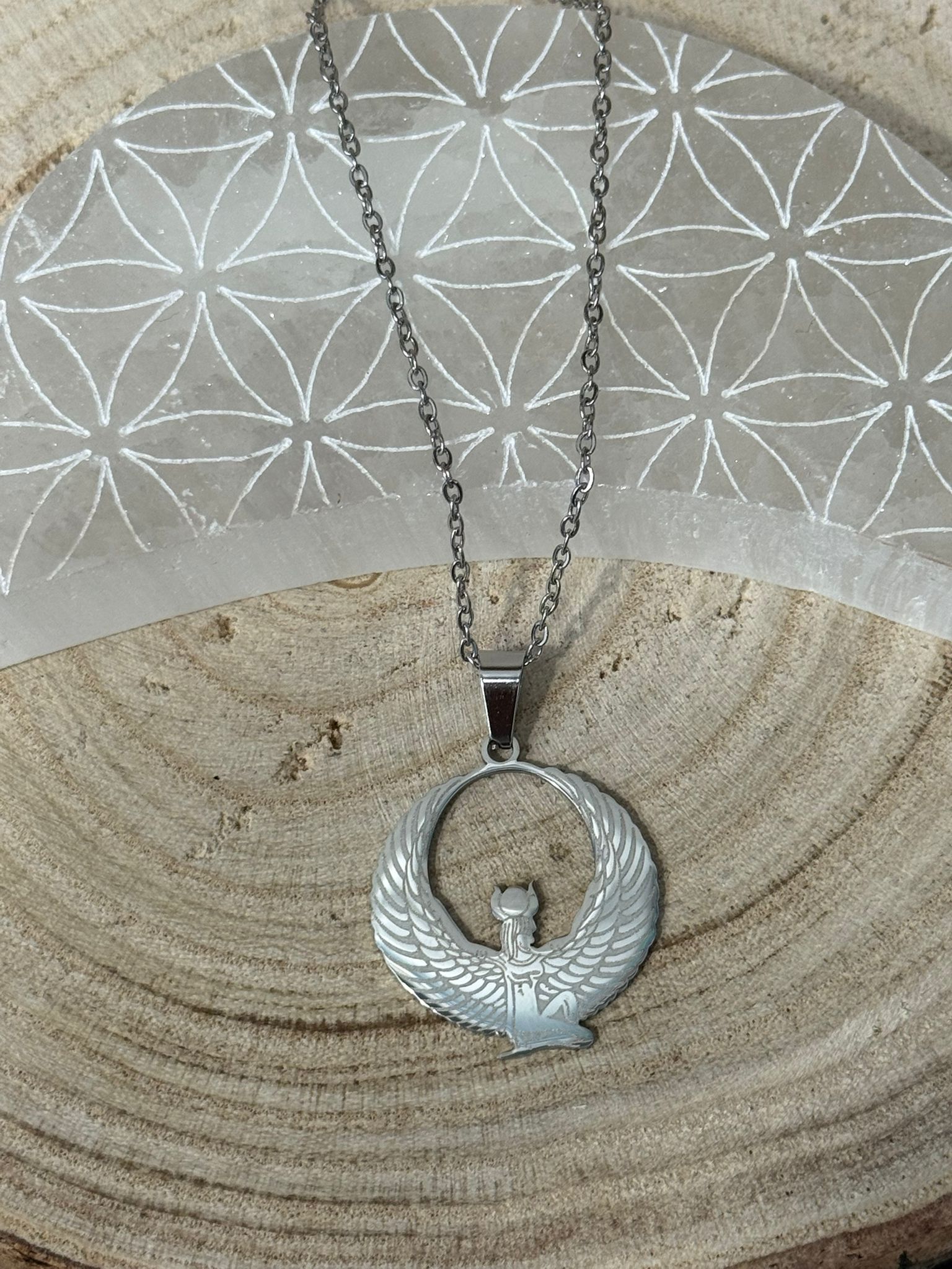 Este colgante no es solo un accesorio: es un símbolo viviente de la energía de Isis, quien te envuelve con sus alas para recordarte que eres fuente de vida, poder y magia sagrada.