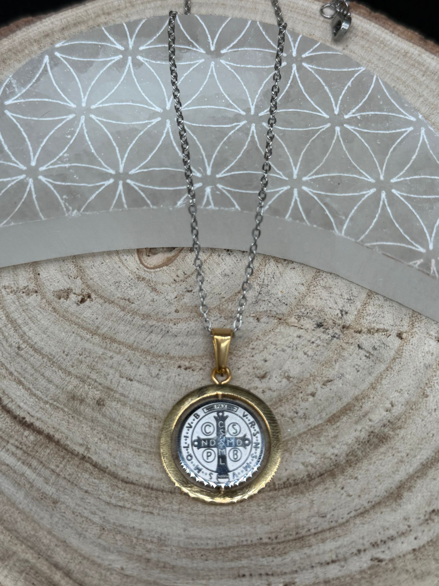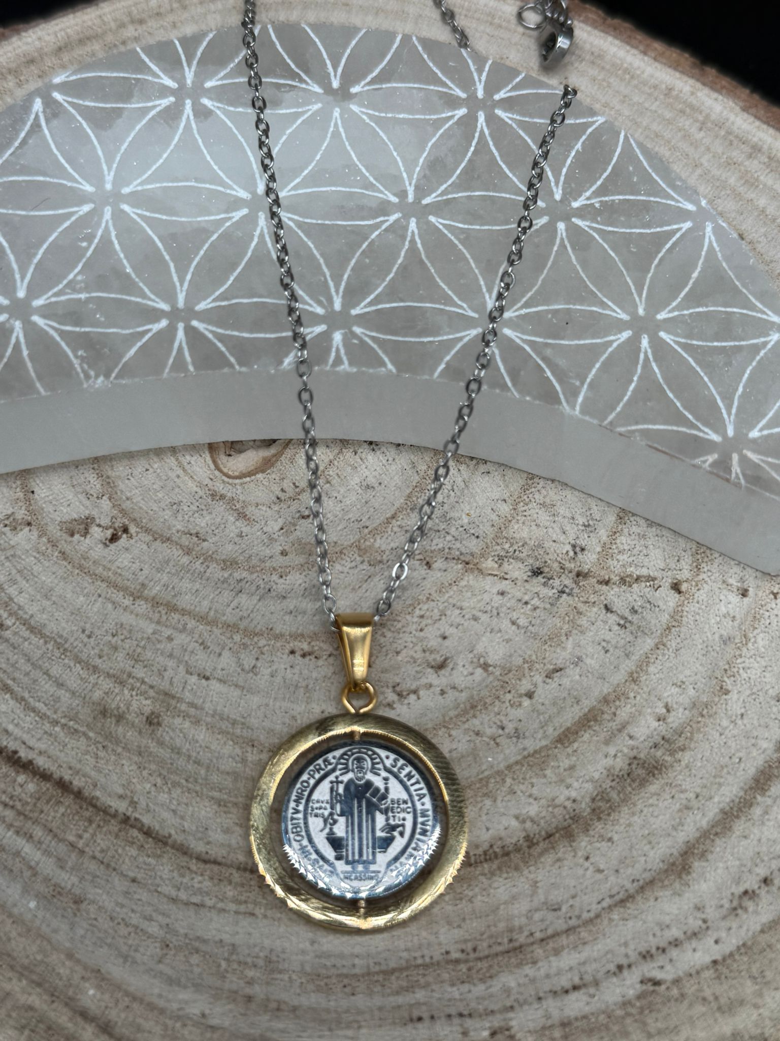 Este colgante no es solo una joya: es una herramienta viva de fe y resguardo. Con su diseño giratorio, la medalla de San Benito te acompaña con fuerza, movimiento y presencia, guiándote y protegiéndote en cada paso del camino.