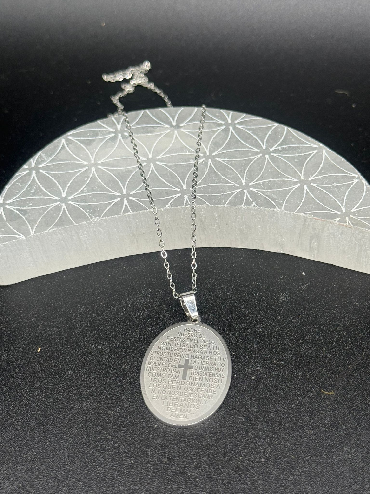 Colgante Acero Plateado Medalla Ovalada con Cruz y Oracion Padre Nuestro