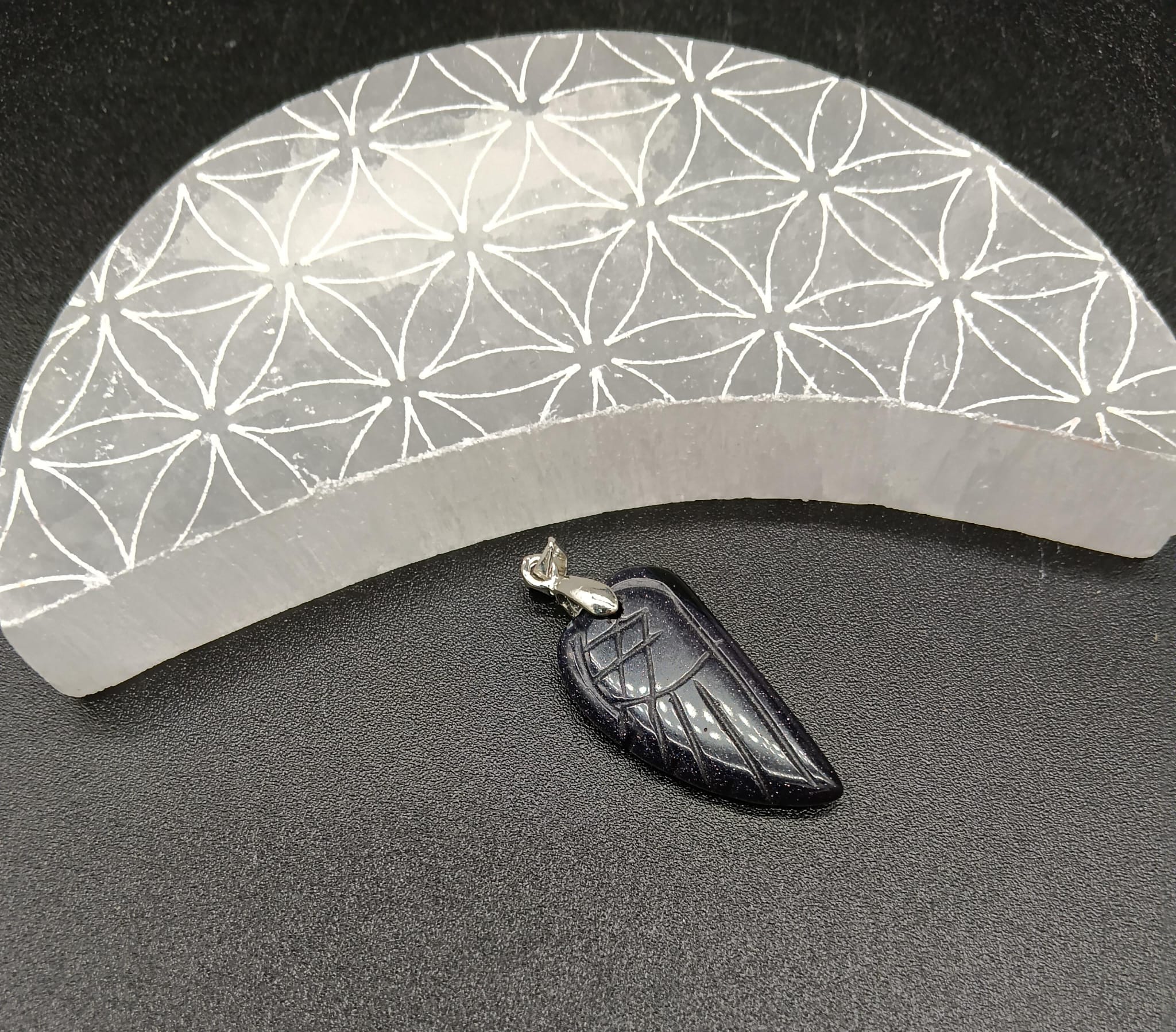 Este colgante en forma de ala, elaborado en aventurina azul natural, es un símbolo de calma, claridad mental y comunicación consciente. La aventurina azul es una piedra asociada a la serenidad interior y al equilibrio emocional, utilizada para apaciguar la mente y favorecer pensamientos claros y ordenados.