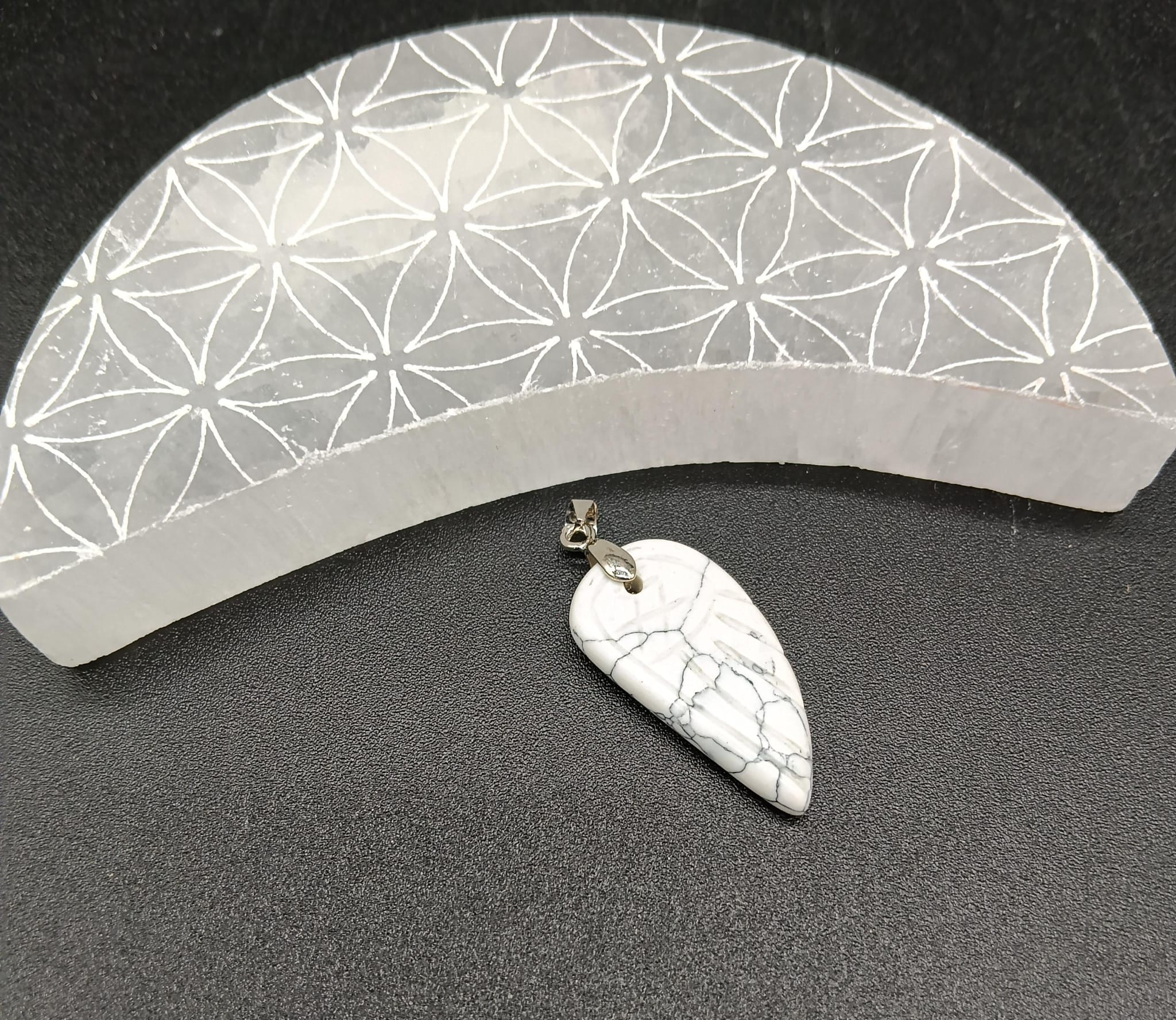 Este colgante en forma de ala, tallado en howlita natural, es un símbolo de calma, conciencia y equilibrio interior. La howlita es una piedra asociada a la serenidad mental y a la reducción del estrés, utilizada para aquietar la mente y favorecer estados de paz y claridad emocional.