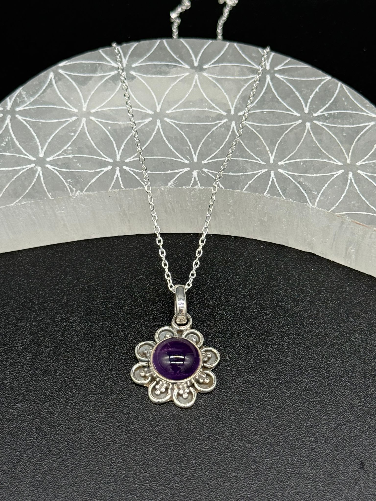 Este delicado colgante ha sido elaborado en plata de ley 925 y engarzado con una amatista natural, conocida por ser una de las piedras más poderosas para la armonización del cuerpo, la mente y el espíritu.