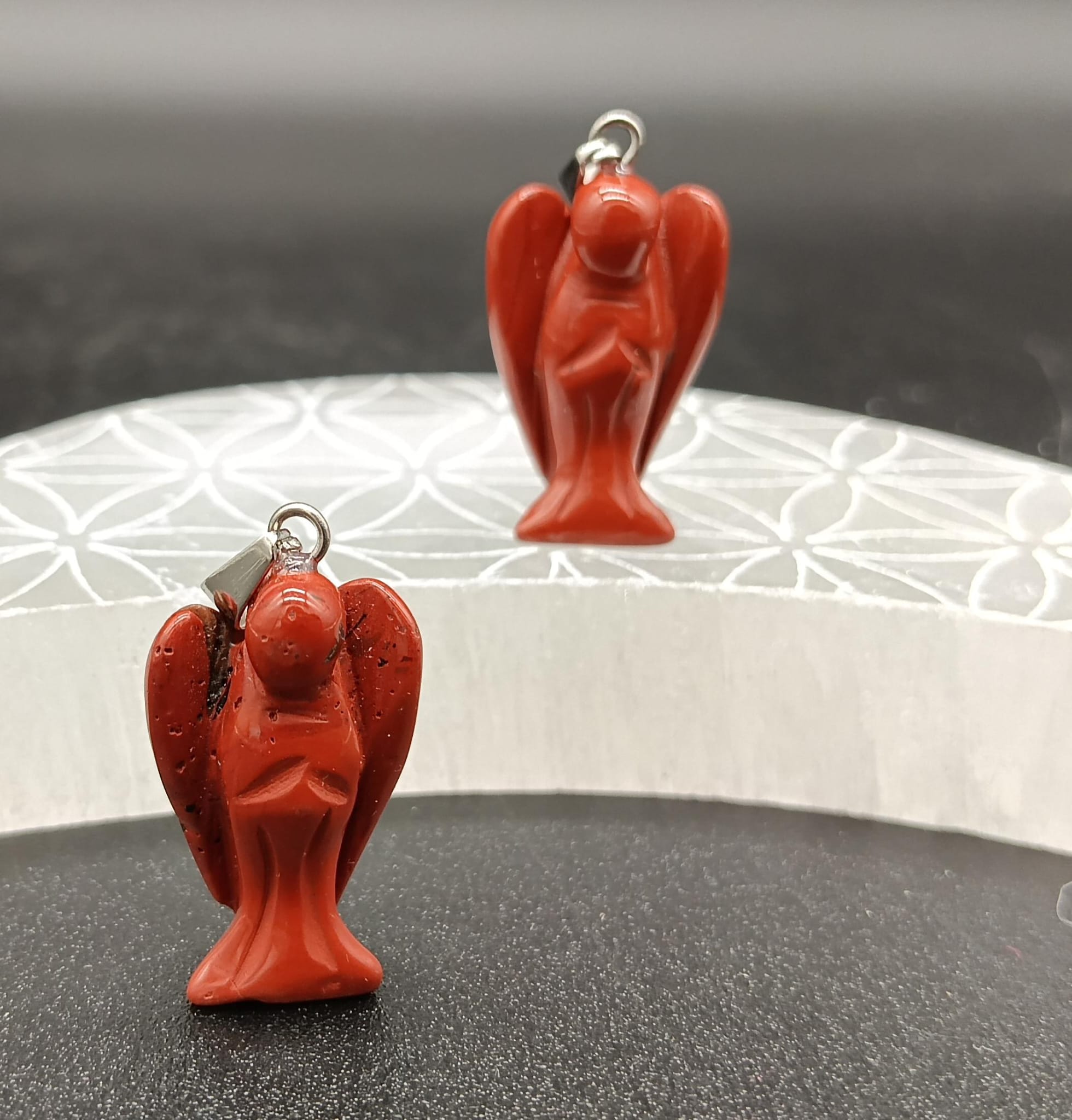 Colgante de ángel tallado en jaspe rojo natural, de aproximadamente 2 cm de altura. Esta pieza representa la protección, la fuerza y el enraizamiento energético. El jaspe rojo es una piedra asociada a la vitalidad, la estabilidad y la conexión con la energía de la tierra, vinculada al chakra raíz, favoreciendo la seguridad, el coraje y la resistencia emocional. Ideal para fortalecer la energía física, aportar determinación y brindar equilibrio en momentos de cambio. Cada colgante es único en tonalidad y patrones naturales, reflejando la energía sólida y protectora del mineral.