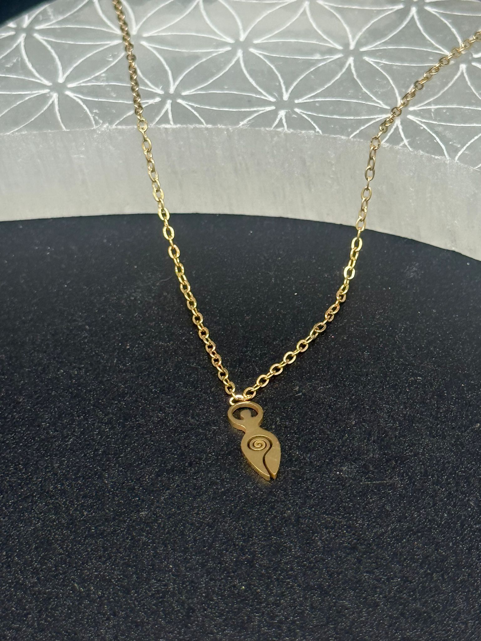 Colgante de la Diosa de la Fertilidad con Símbolo en Espiral – Wicca – Acero Dorado