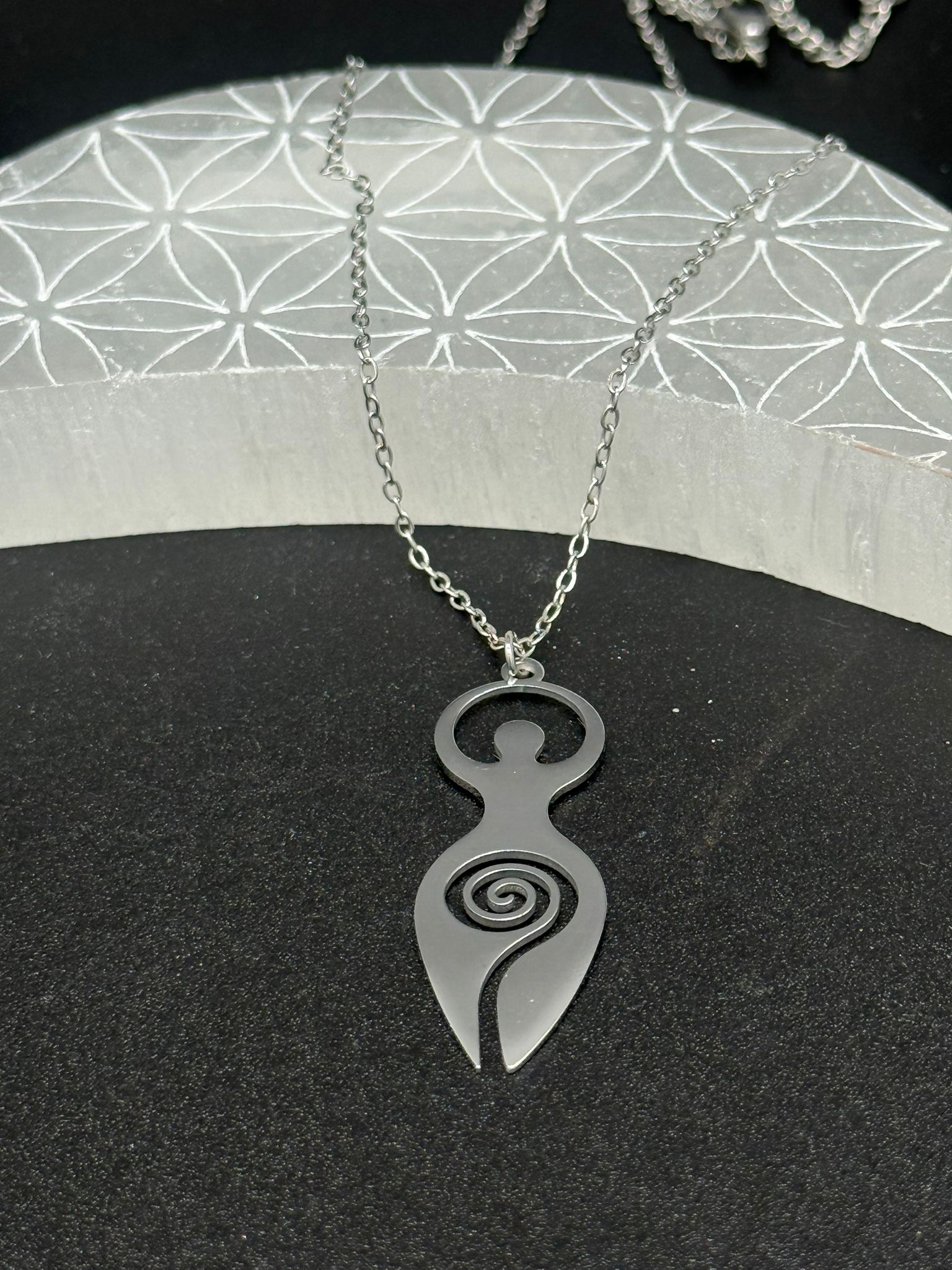 Colgante de la Diosa de la Fertilidad con Símbolo en Espiral – Wicca – Acero Plateado