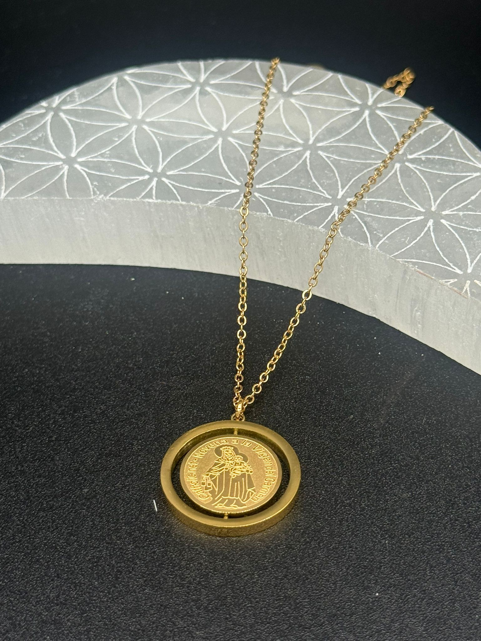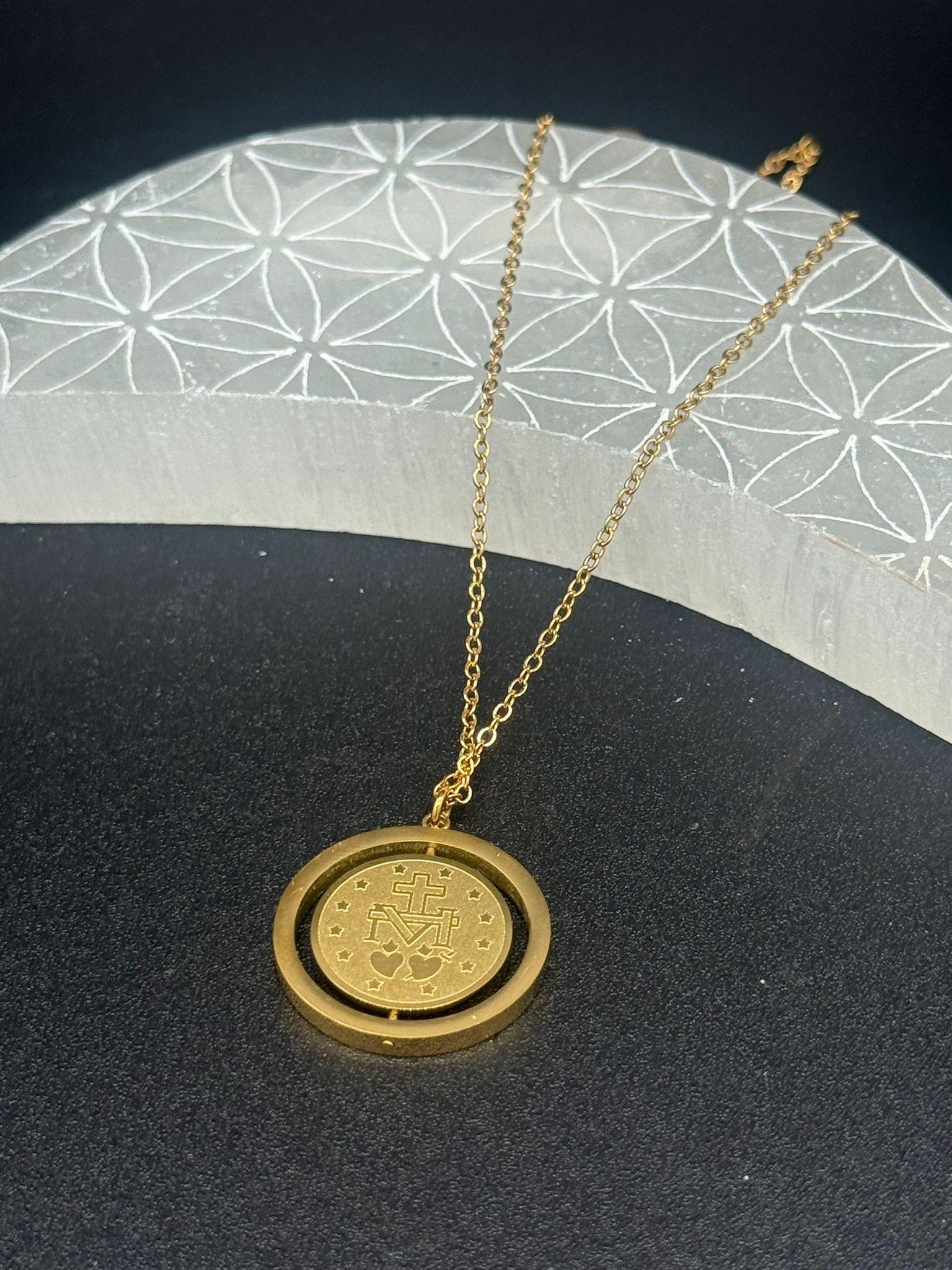El colgante está elaborado en acero dorado, un material resistente y duradero, cuyo brillo cálido evoca la presencia luminosa y activa de lo divino. El color dorado está asociado a la energía solar, la vitalidad, la abundancia espiritual y la acción protectora de lo sagrado. Es ideal para quienes desean llevar con ellos una luz constante de fe y esperanza.