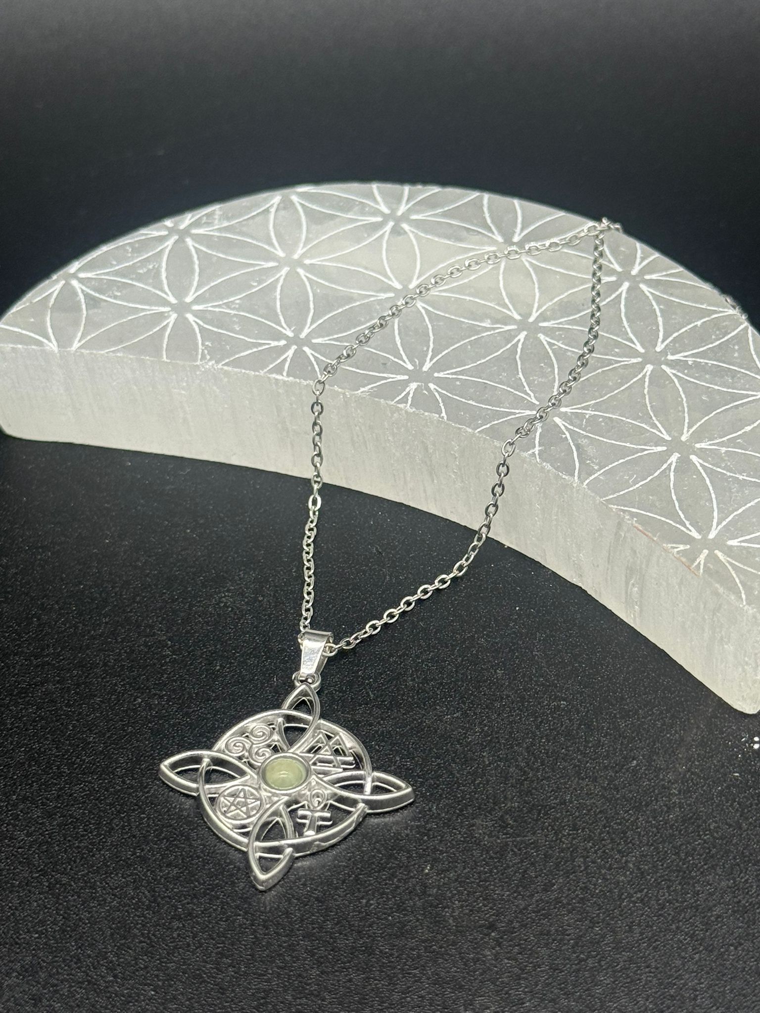 Este colgante es un faro para el alma, un talismán de visión profunda y protección energética, en el que el ancestral nudo de bruja entreteje caminos invisibles y guía los pasos del buscador espiritual. Es un símbolo de conexión, de ciclos entrelazados, de destinos que se cruzan por diseño sagrado. No es solo una joya: es un espejo del alma que recuerda quién eres y hacia dónde vas.
