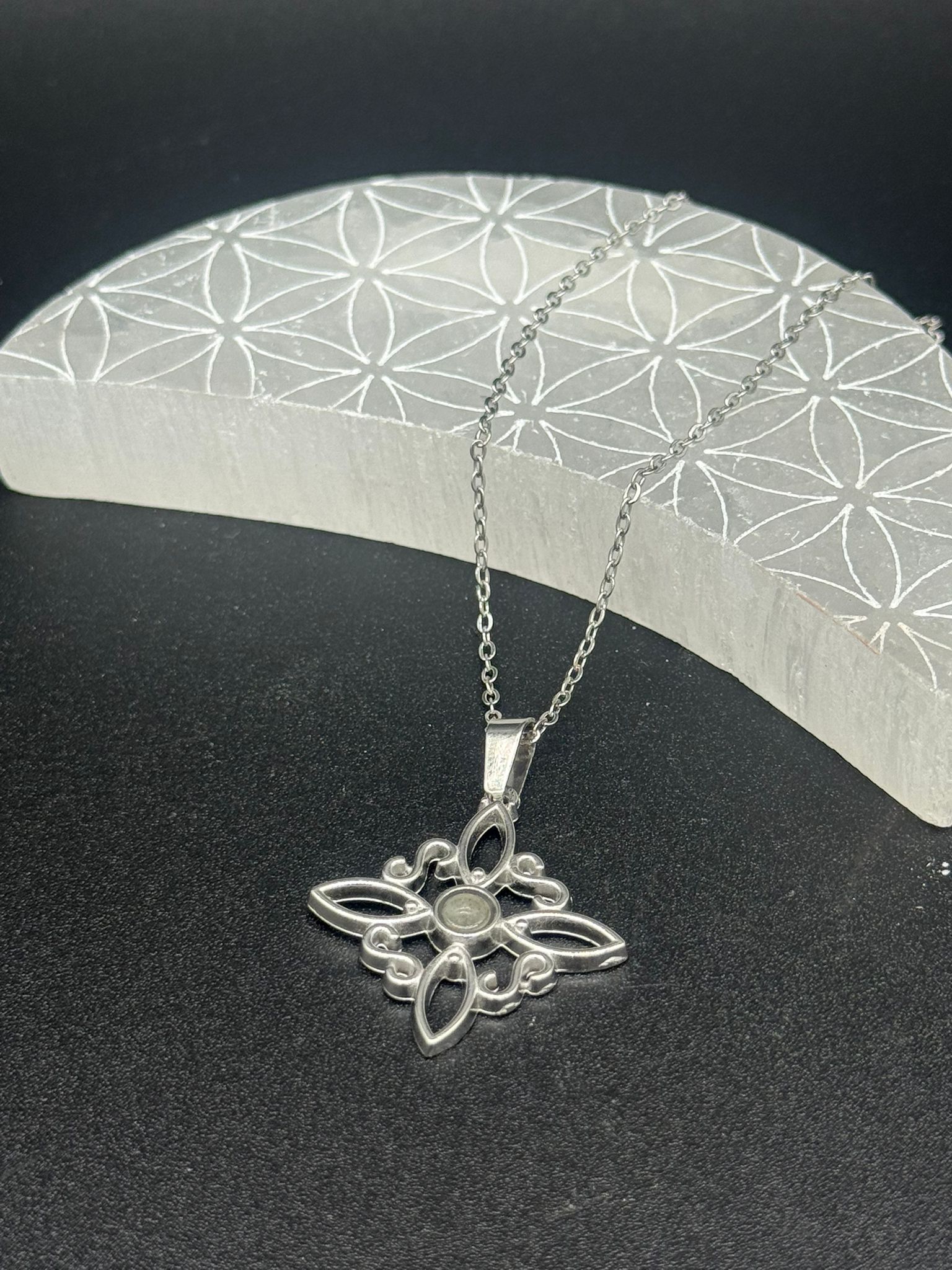 El colgante está elaborado en acero inoxidable, un material resistente y neutral que resguarda la energía del símbolo y potencia la vibración natural de la piedra.