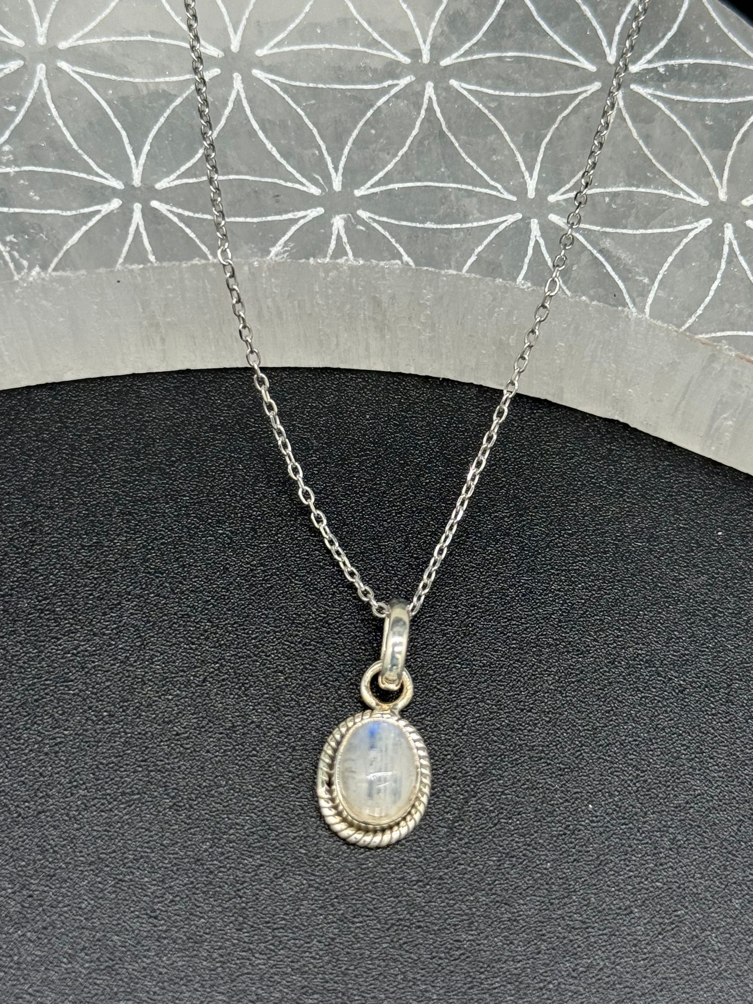Este colgante está elaborado en plata de ley 925 y engarzado con una piedra luna natural, una gema sagrada asociada a la energía femenina, los ciclos lunares y la percepción sutil. Su brillo iridiscente evoca la luz de la luna y sus misterios, convirtiéndola en una aliada ideal para quienes buscan profundidad emocional, claridad intuitiva y conexión espiritual.