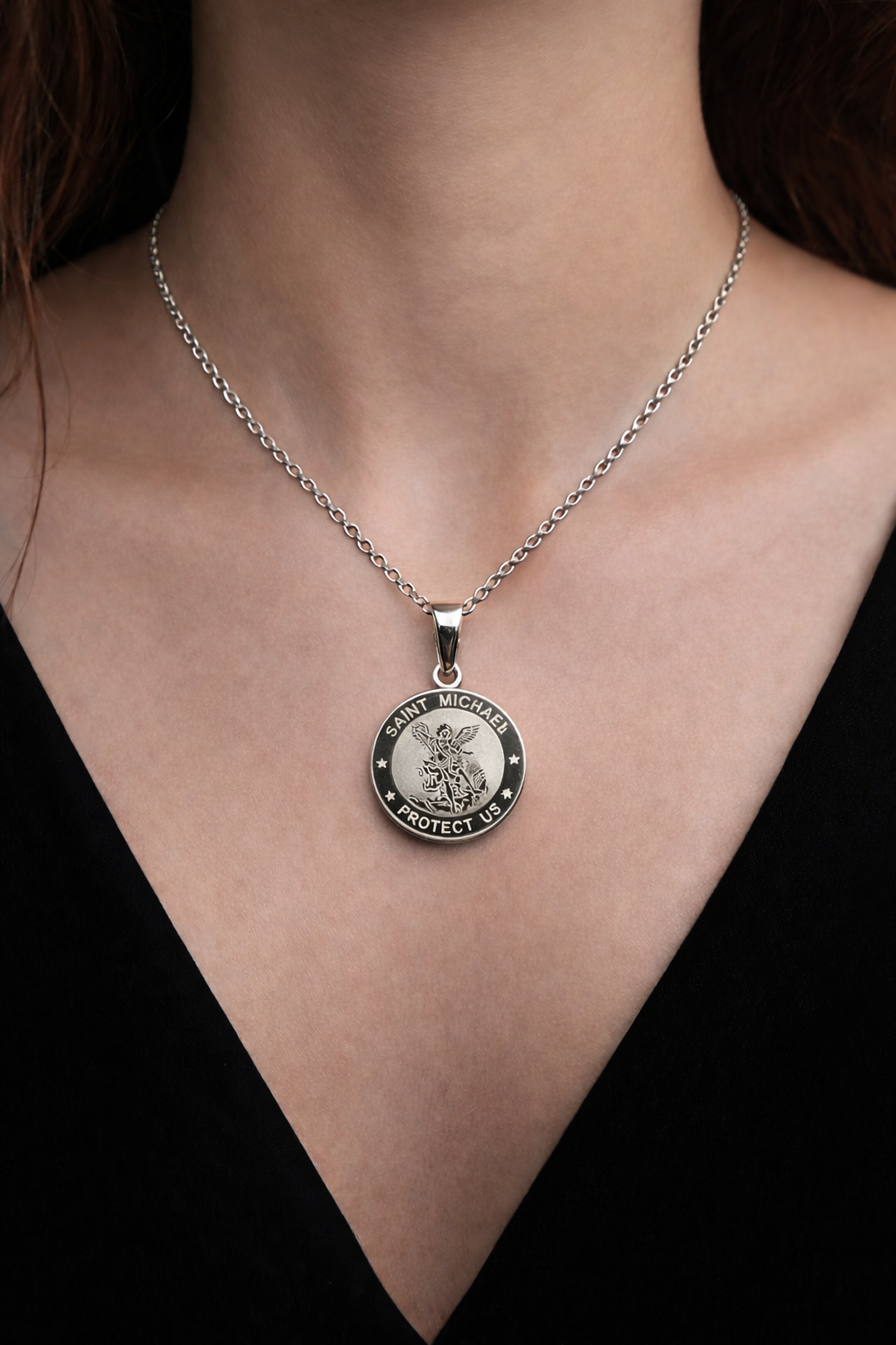 Colgante de acero inoxidable con medalla redonda de San Miguel Arcángel, símbolo de protección, fuerza y defensa espiritual. El diseño muestra a San Miguel venciendo al mal, acompañado de la inscripción “Saint Michael Protect Us”, aportando un significado profundo y protector a la pieza.