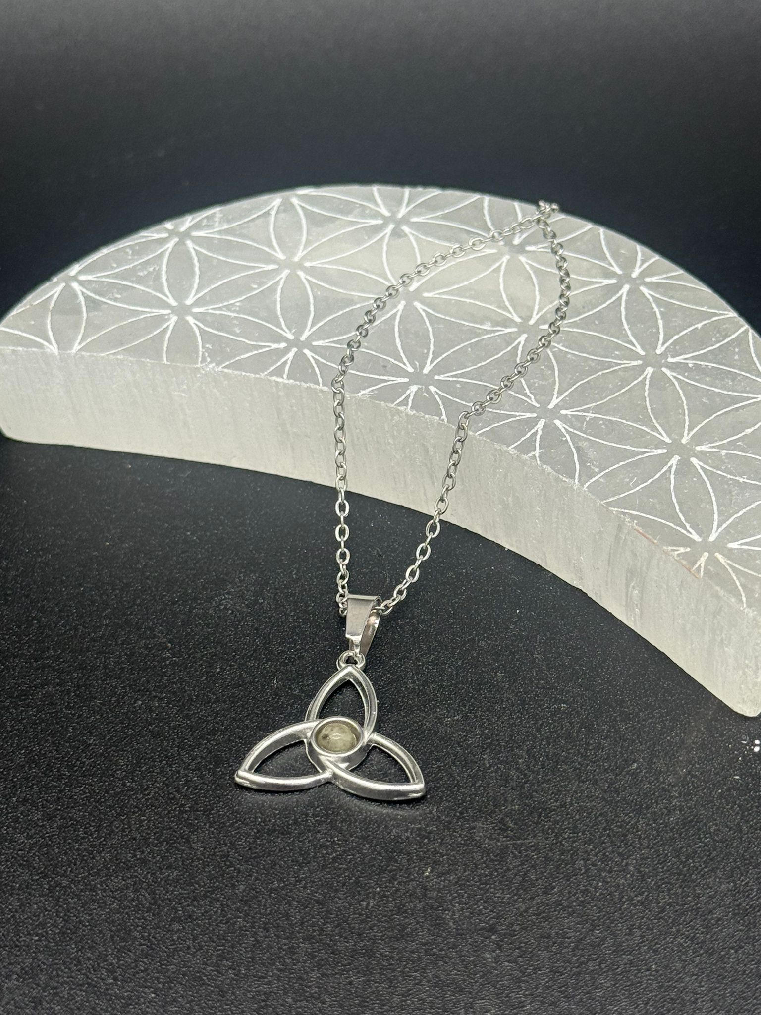Este colgante reúne el poder de los símbolos y la magia de lo invisible. En su centro, una labradorita iridiscente despierta destellos de luz entre sombras, mientras la triqueta celta, forjada en acero inoxidable plateado, sostiene su energía con firmeza y elegancia. Es una pieza que no solo protege, sino que guía. No solo acompaña, sino que transforma.