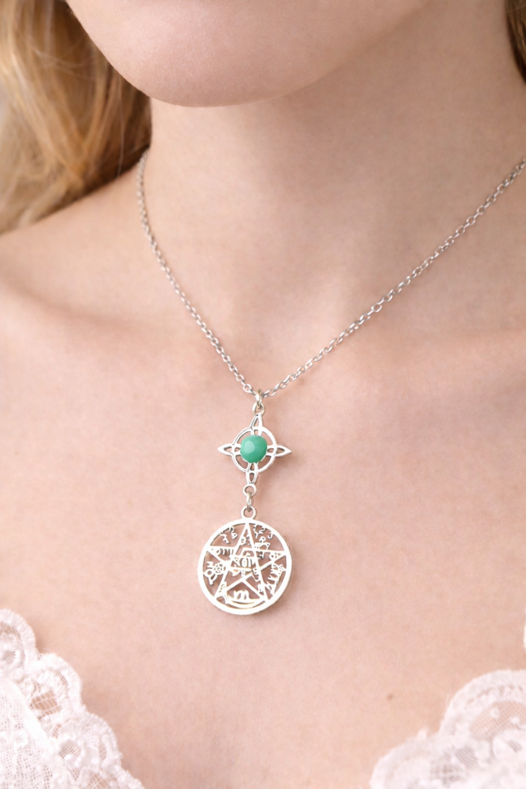 Colgante Doble Protección Acero con Aventurina en Nudo de Bruja