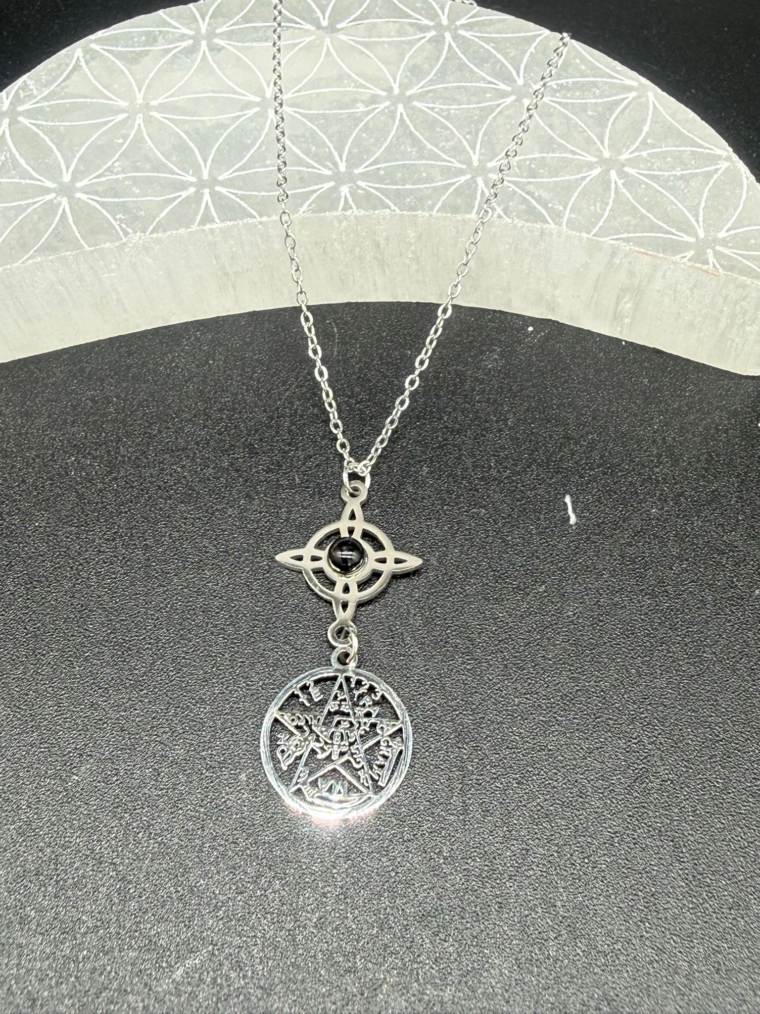 Este colgante de doble protección es una pieza espiritual de gran fuerza simbólica, elaborada en acero inoxidable y diseñada para integrar dos poderosos emblemas de resguardo energético: el Nudo de Bruja y el Tetragramatón. Su combinación crea un amuleto destinado a proteger, sellar y fortalecer el campo energético personal frente a influencias negativas.