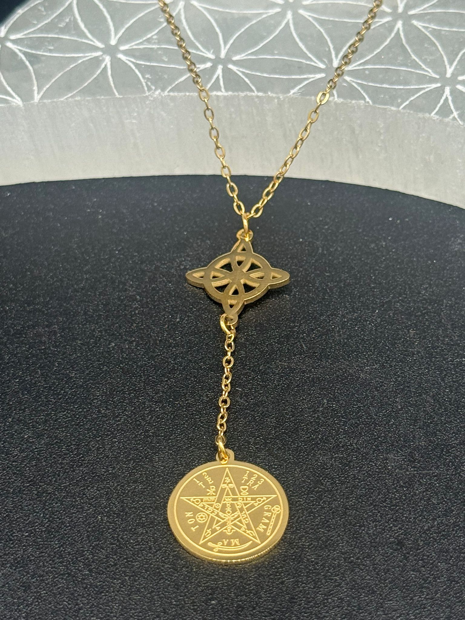 Este impresionante colgante está elaborado en acero inoxidable de alta calidad con acabado dorado, resistente al paso del tiempo, al desgaste y a las energías externas. Su diseño único fusiona dos de los símbolos de protección más poderosos del mundo esotérico: el Nudo de Bruja (Witch’s Knot) y el Tetragramatón, creando un escudo espiritual de doble fuerza.