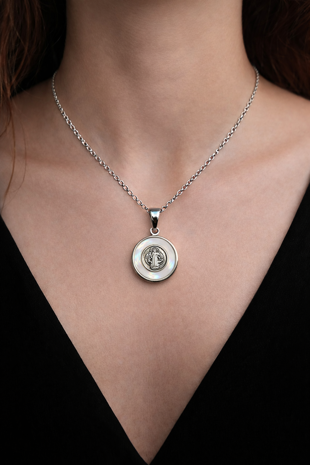 Este modelo incorpora nácar natural alrededor de la medalla, aportando un acabado elegante y luminoso que realza el diseño clásico. El contraste entre el brillo iridiscente del nácar y el acero inoxidable convierte a este colgante en una pieza refinada y con gran presencia.
