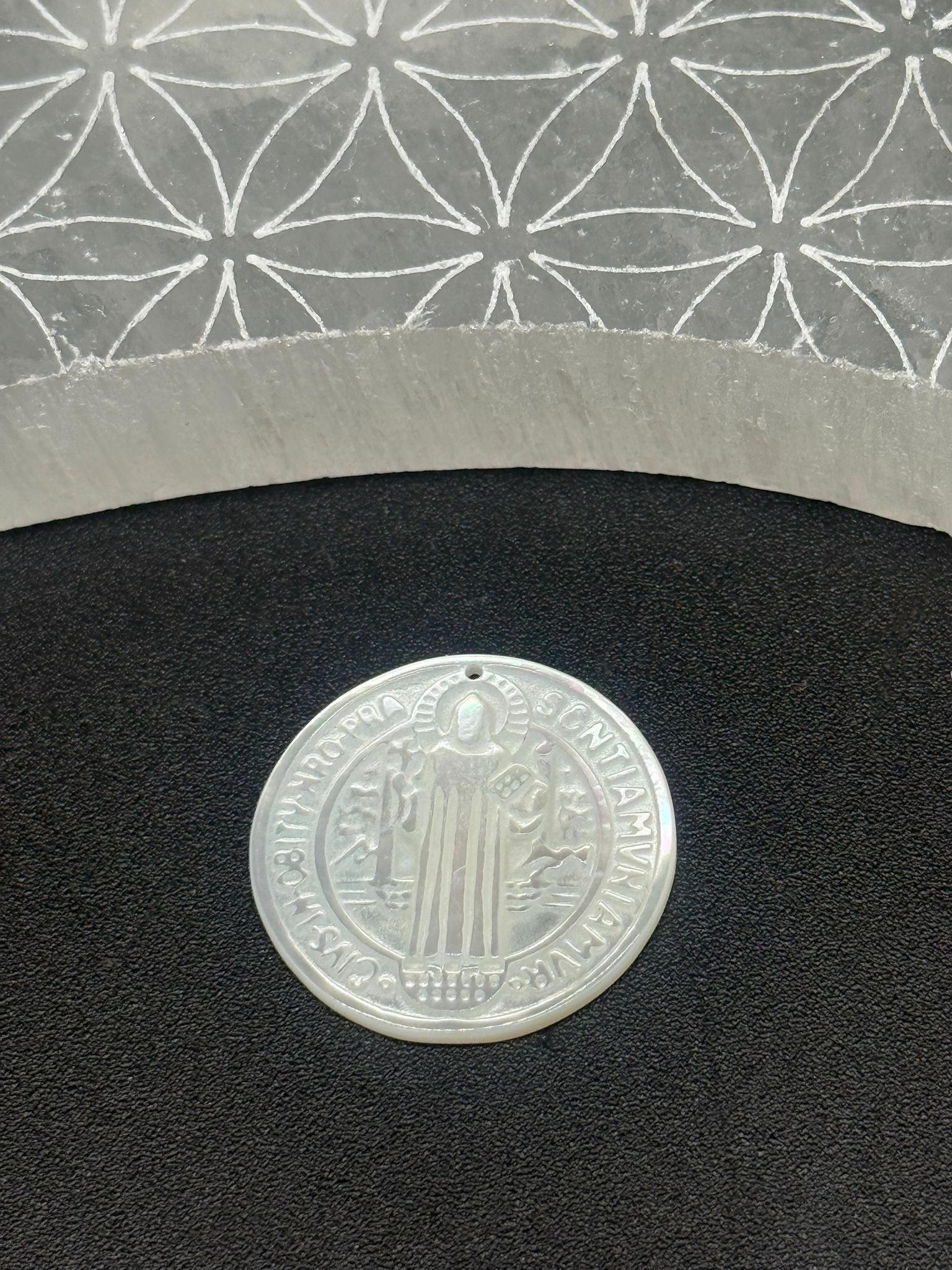 Colgante de Nácar con Imagen de San Benito Grabado – Protección y Fe