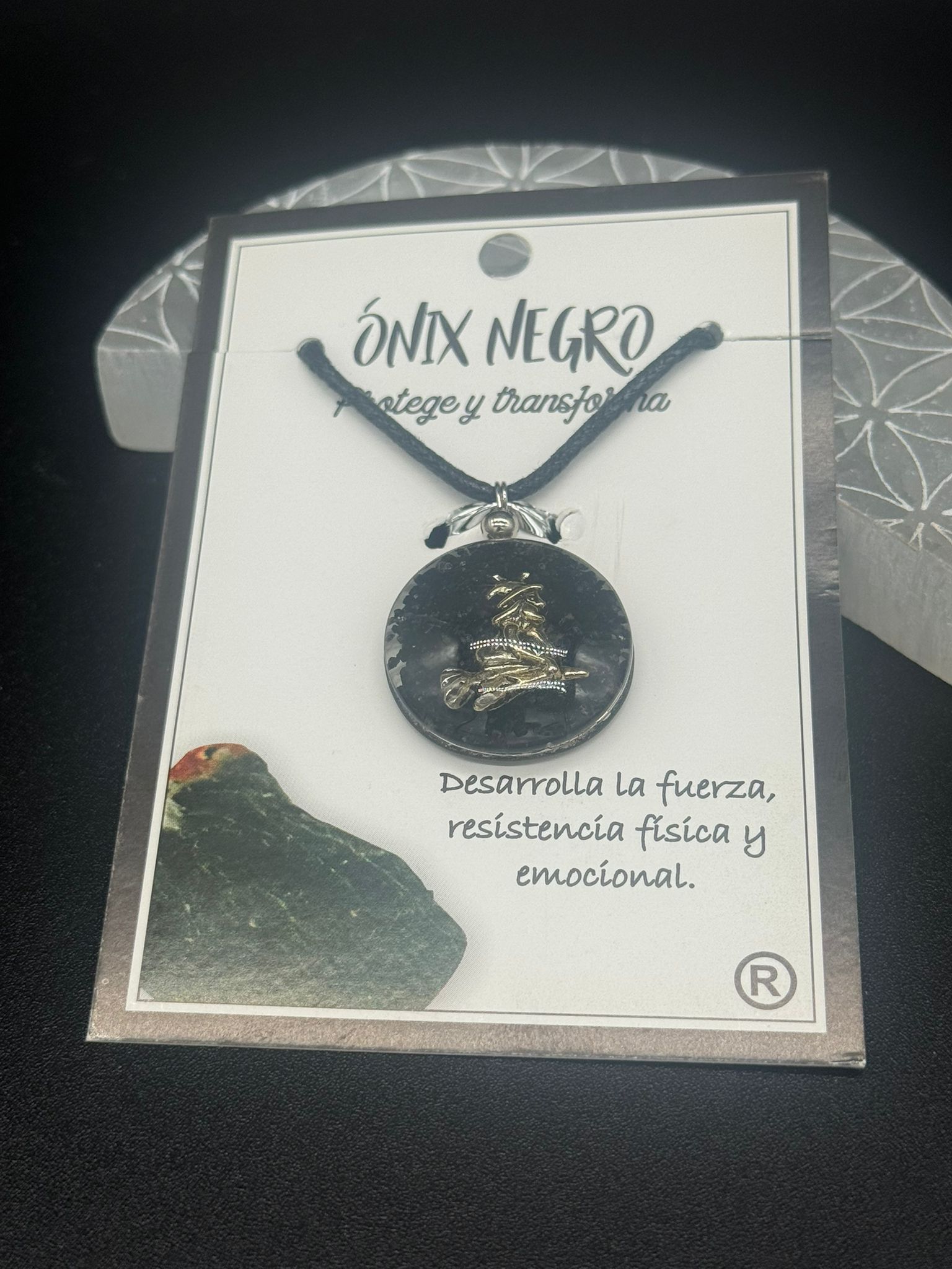 En el centro se encuentra una piedra de ónix negro, conocida por su capacidad para absorber y transmutar la negatividad. El ónix protege, fortalece y ayuda a mantener la mente clara y centrada, incluso en momentos de caos emocional o mental. Es una piedra que ancla, que da firmeza y te conecta con tu base, recordándote tu poder interno.