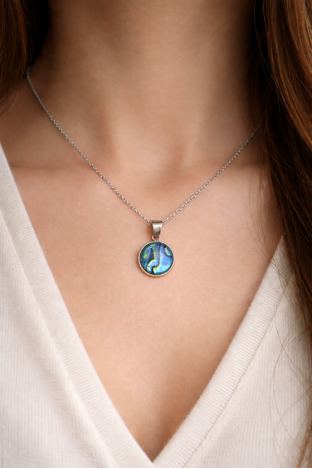 Este elegante colgante redondo destaca por su interior de concha abulón, conocida por sus reflejos iridiscentes en tonos azul, verde y violeta. Cada pieza presenta un dibujo único y natural, creando un efecto luminoso que cambia según la luz y el movimiento.