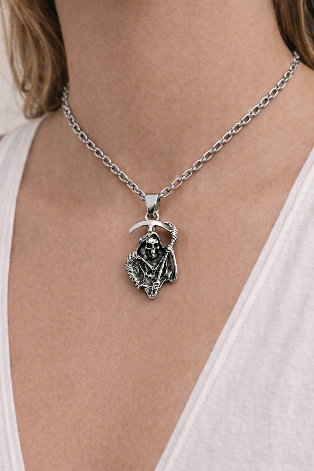 Colgante de Santa Muerte elaborado en acero inoxidable, representada con túnica y guadaña, símbolo del corte de energías negativas, protección y transformación. El diseño muestra un alto nivel de detalle en el rostro, la vestimenta y la guadaña, aportando fuerza visual y carácter a la pieza.