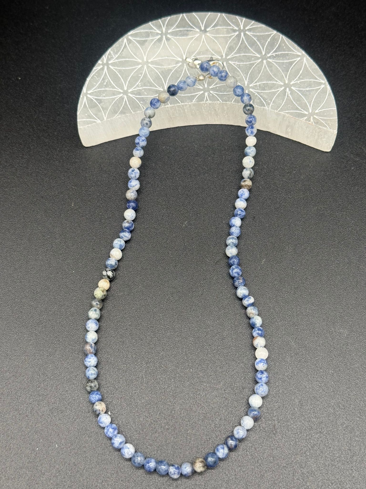 Este collar está elaborado con finas cuentas de sodalita natural de 4 mm, creando una pieza equilibrada y elegante de 40 cm de longitud. Su energía profunda y serena favorece la claridad mental, la coherencia emocional y la expresión auténtica.
