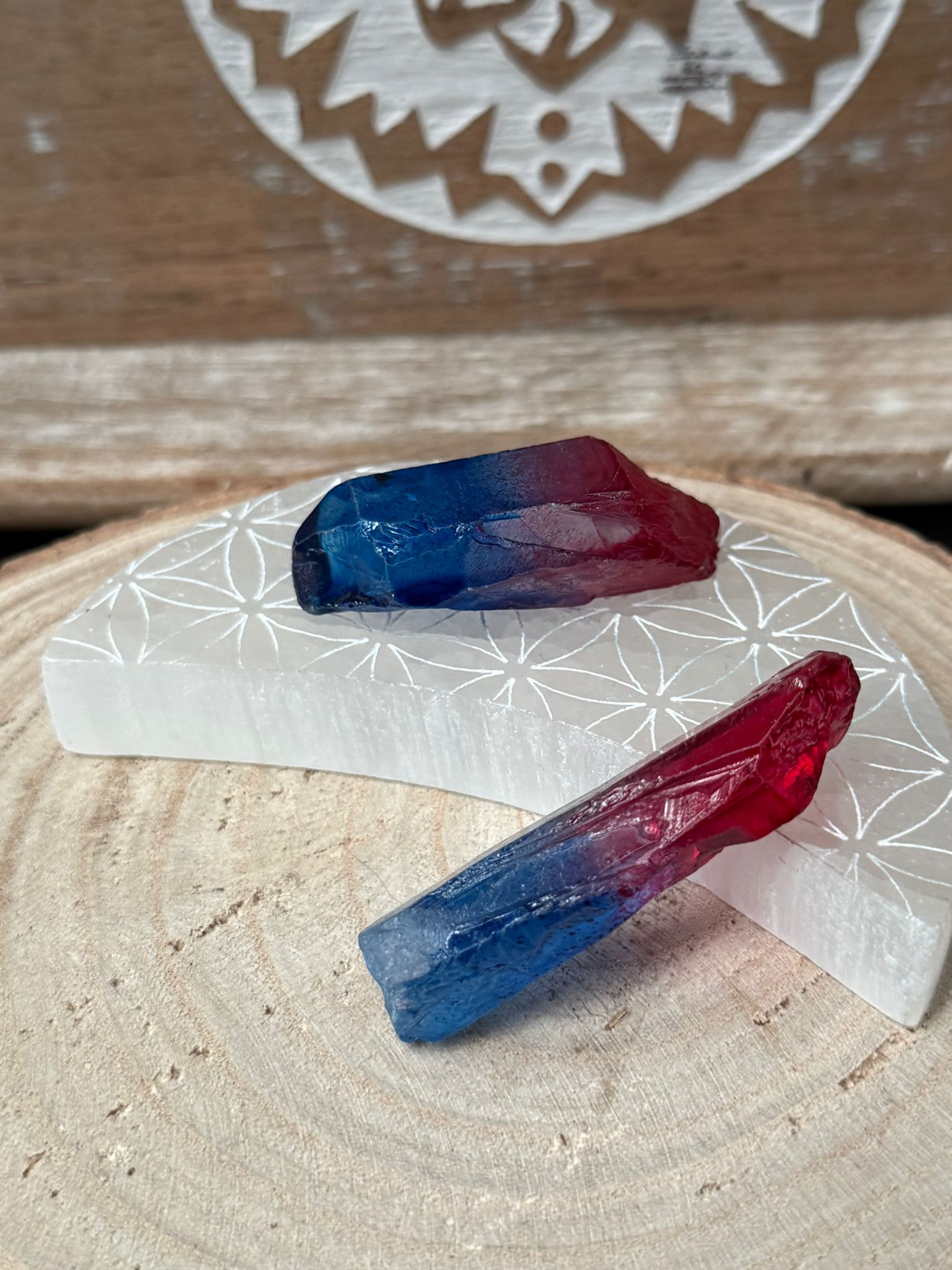 El cuarzo aura tanzina es un cristal de alta vibración, resultado de la unión alquímica entre cuarzo natural y metales preciosos (como el oro, indio o niobio), que le otorgan su característico brillo iridiscente en tonos púrpura, azul y violeta. Esta fusión crea una piedra vibracionalmente elevada, ideal para trabajos espirituales profundos, conexión con planos superiores y activación de la intuición.