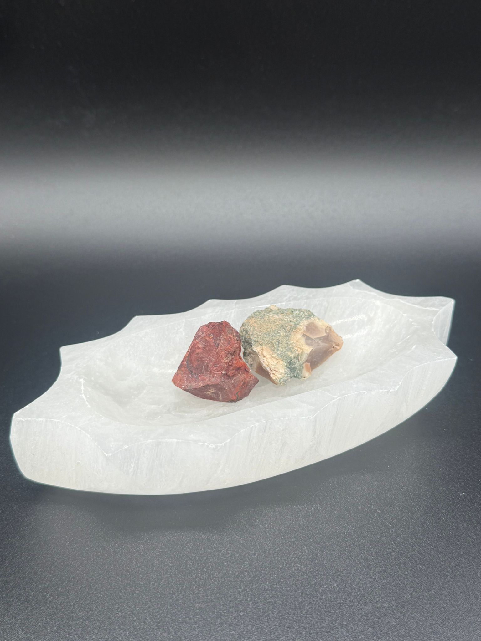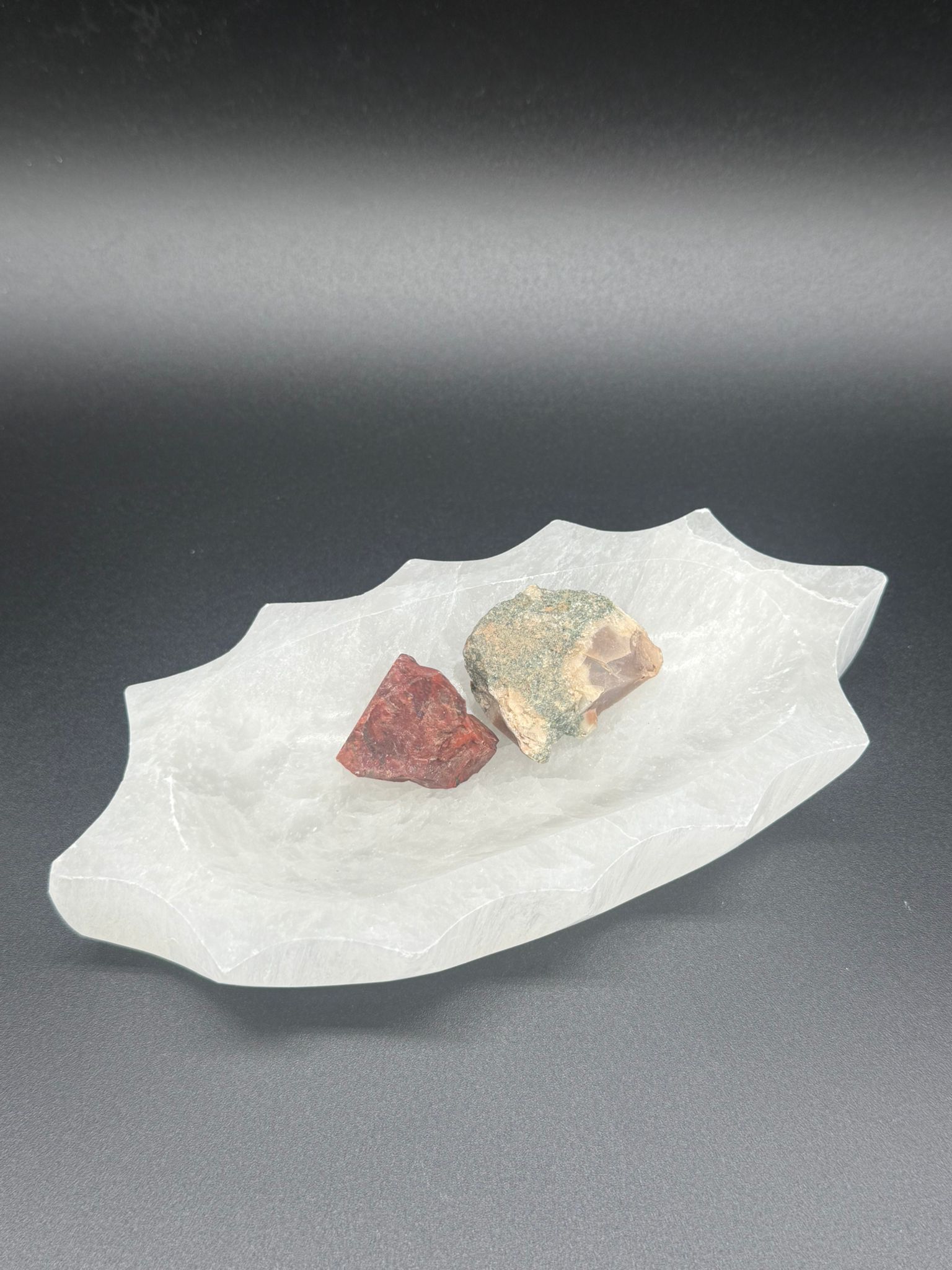 Este imponente cuenco de selenita, de aproximadamente 18 x 8,5 cm, presenta un diseño tallado con bordes puntiagudos que evocan la forma de una hoja de árbol dentada. Su contorno orgánico y su acabado artesanal lo convierten en una pieza única, no solo por su belleza natural, sino también por su profunda carga simbólica. La forma de hoja representa el ciclo de la vida, el crecimiento y la renovación constante, lo que potencia su uso como contenedor de energía en prácticas espirituales.