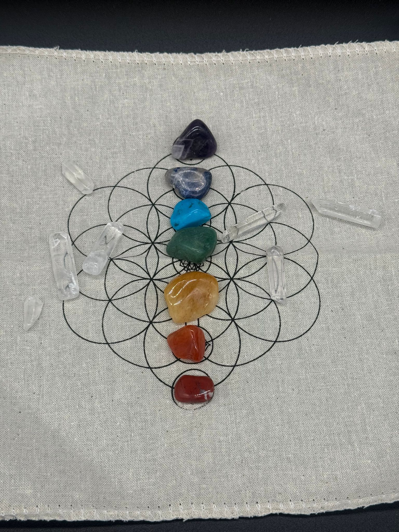 Expositor que incluye 12 rejillas de cristal para los 7 chakras, cada una equipada con piedras preciosas cuidadosamente seleccionadas (amatista, sodalita, howlita, aventurina verde, aventurina amarilla, cornalina, jaspe rojo) destinadas a estabilizar los chakras correspondientes, y 6 puntos de cuarzo transparente para potenciar este efecto. Cada rejilla es compacta y está lista para su uso inmediato.